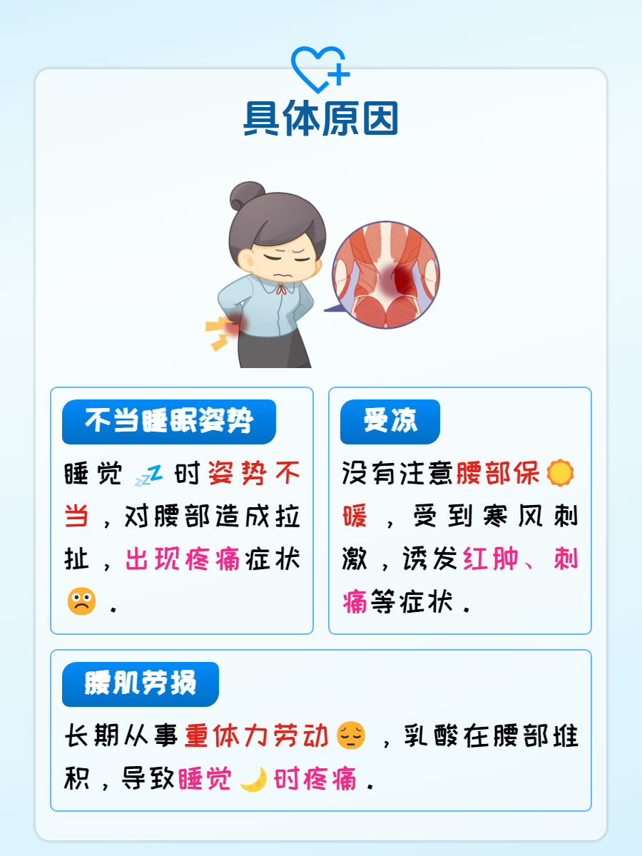 🌈3、腰肌劳损:长时间保持同一姿势、重体力劳动等原因,容易使腰部肌肉和筋膜部位充血水肿,造成夜间疼痛的情况。