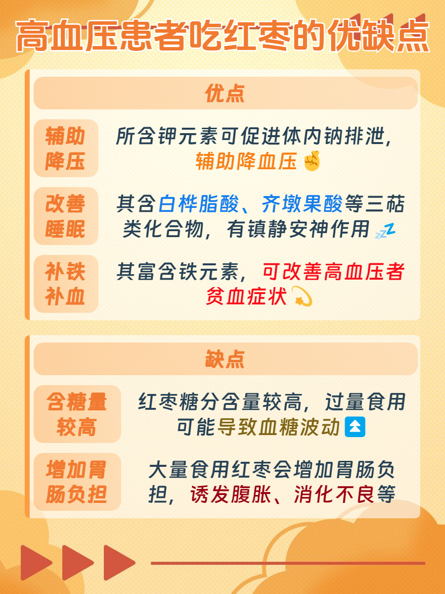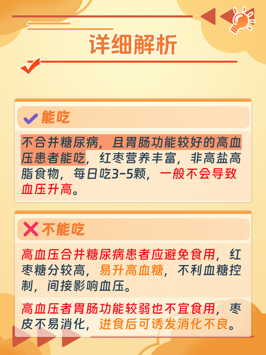🌺合并糖尿病:红枣中的糖分含量较高,若高血压患者合并糖尿病,尽量少吃或不吃红枣,以免使血糖迅速升高,影响血糖控制,血糖控制不佳又会影响高血压病情,增加心血管并发症风险。