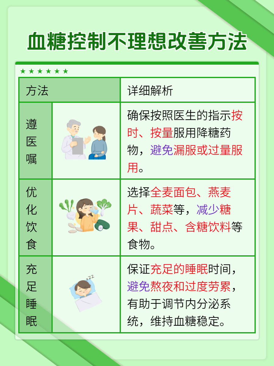 2、药物剂量:有时,即使按时服药,但如果药物剂量不足或者出现了药物耐受性,都可能导致血糖控制不佳。
