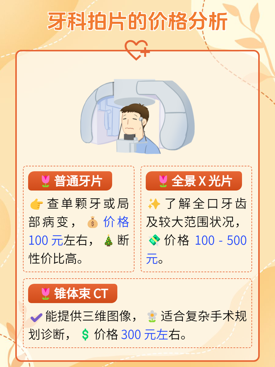 ✨全景X光片:如果你想知道全口牙齿的整体状况,或者检查颌骨、牙周等较大范围的情况,可以进行全景X光片,能让口腔状况一目了然,但价格相对较高,大约在100元-500元之间💰,但绝对值得投资。