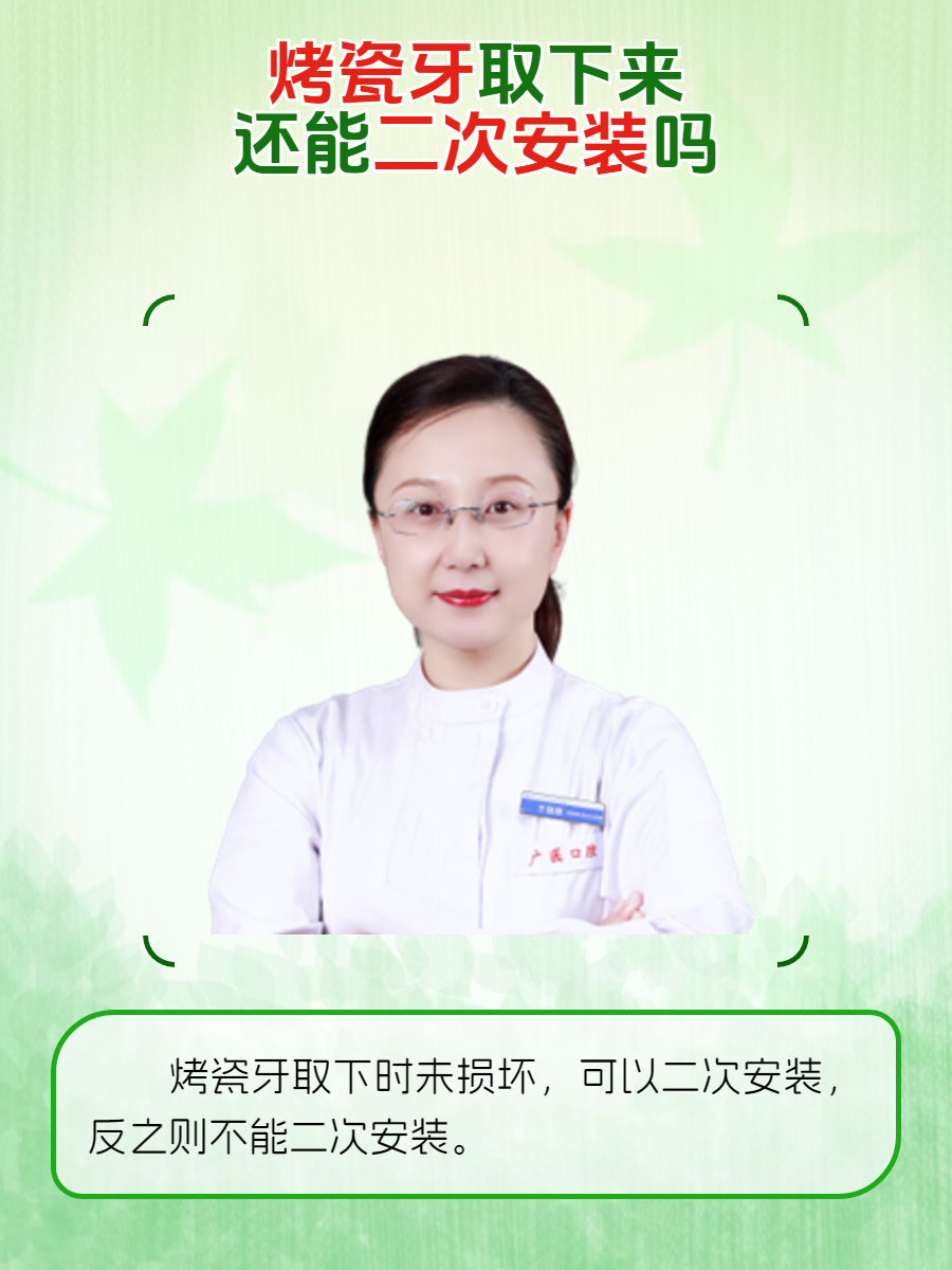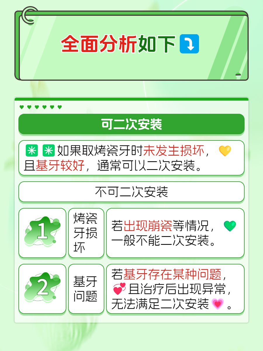😄如果烤瓷牙在取下过程中没有受到明显的损坏,🌈且基牙状况良好,没有出现严重的龋坏、🌱折裂等问题,我认为这种情况经过清洁消毒等处理后,可以进行二次安装。