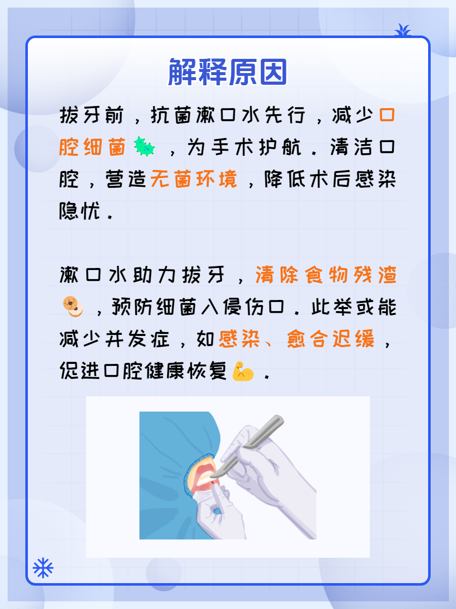 💙拔牙是一种常见的口腔治疗方法,很多人在拔牙前会有疑问,拔牙需要先用漱口水吗?那就让我们来了解一下这个疑问哦。