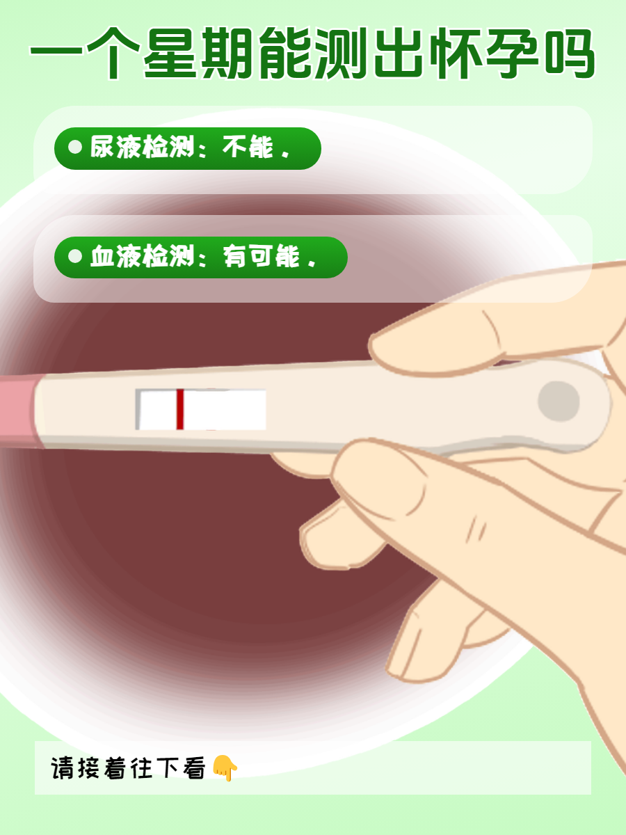 怀孕是指妊娠。月经前一个星期一般不可以测出妊娠,建议等待一段时间再检测。妊娠测试是通过检测尿液中的人绒毛膜促性腺激素水平判断。人绒毛膜促性腺激是一种由胎盘产生的激素,通常在受精卵着床后开始产生。正常情... 详细»