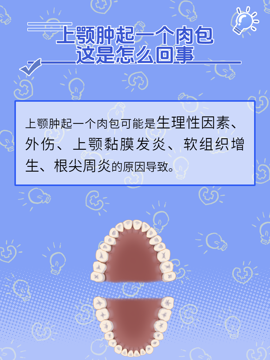 🔹4、软组织增生:上颚的肉包可能是软组织增生引起的,如黏液囊肿、纤维瘤等。这些包块如果长时间不吸收,可能需要手术切除。