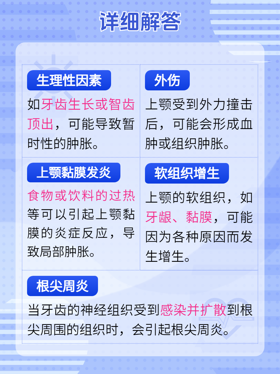 我时常会遇到患者因为上颚肿起一个肉包而前来就诊。这种情况虽然常见,但背后的原因却多种多样,从简单的生理结构变化到复杂的病理状态都有可能。今天,我为大家解析这一现象,并提供一些日常建议。