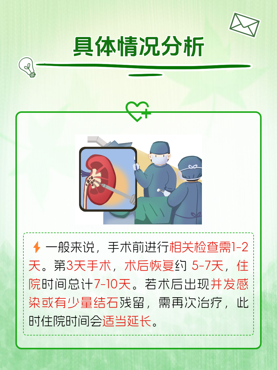 🌈一般而言,手术前需进行相关检查及术前评估,这大约会耗费1至2天时间。在第3天进行手术治疗,术后恢复大概需要5至7天左右,所以住院时间总计约为7至10天。倘若手术后出现并发感染情况,或者仍有少量结石残留,那么就需要进行抗感染治疗,或者施行体外冲击波碎石治疗。对于残石较多的患者,必要时需再次进行手术取石等治疗,此时则需适当延长住院时间。