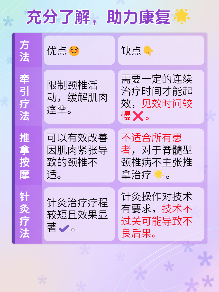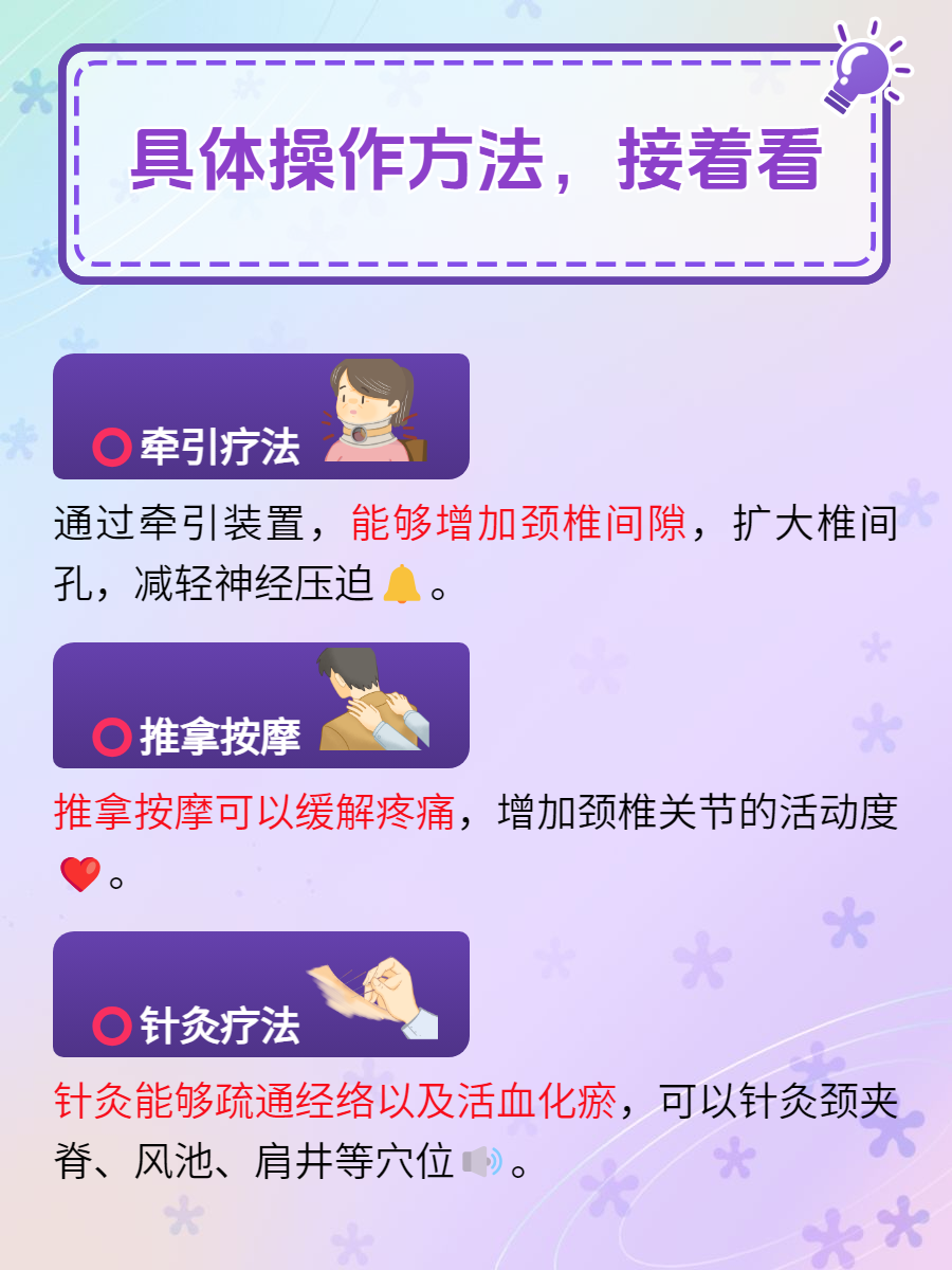 🌻1、牵引疗法:牵引疗法是中医治疗颈椎病的重要手段之一。通过牵引装置,医生可以逐渐增加颈椎间的距离,从而扩大椎间孔,降低椎间盘内的压力。