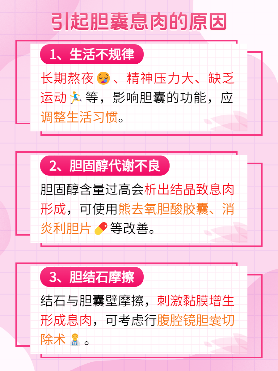 2⃣胆固醇代谢不良:胆汁中胆固醇含量过高,析出结晶形成息肉。可遵医嘱服用一些利胆药物,如熊去氧胆酸胶囊、消炎利胆片,促进胆汁排泄,改善胆固醇代谢。
