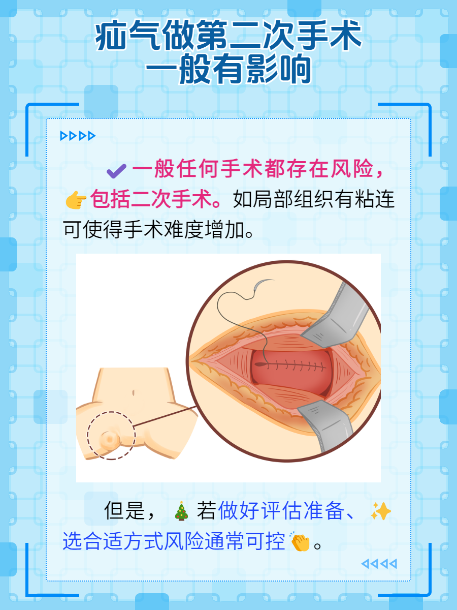 🌟然而,第二次手术也存在一定的风险。比如手术难度可能会增加,因为局部组织可能会有粘连等情况。但这并不意味着一定会有严重的不良影响。只要医生做好充分的术前评估和准备,选择合适的手术方式,通常可以将风险控制在合理范围内。😎