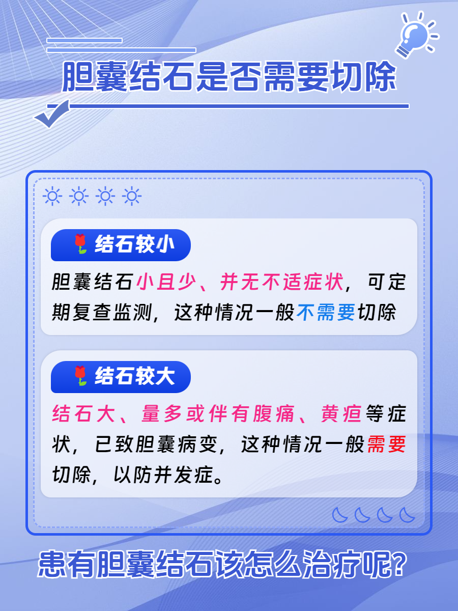 胆囊结石是否一定要切除需要根据患者的具体情况来决定。如果觉得这篇文章对你有所帮助,欢迎点赞并转发哦!