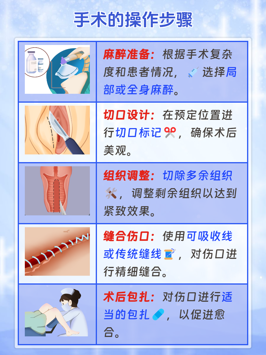 🌈首先,让我们来聊聊紧缩术,是通过手术的方式对阴道进行紧缩处理。手术过程中,医生会根据患者的具体情况,在阴道后壁皮肤与黏膜交界处进行切口,剥离并收紧松弛的肌肉和筋膜,最后使用可吸收缝合线进行缝合。这种缝合线能够在体内逐渐降解吸收,无需二次拆线,减少了患者的痛苦和不便。🖌️