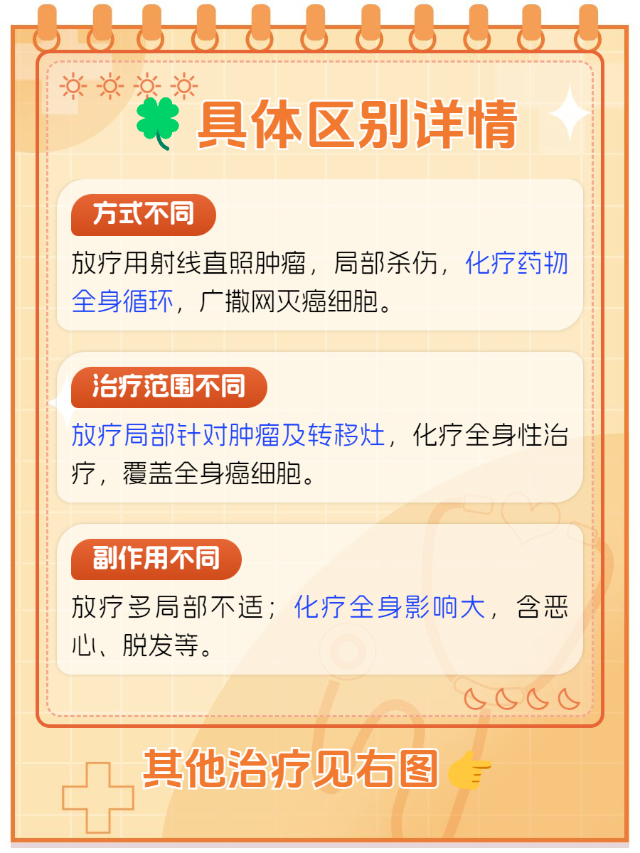 1. 方式不同🔥💊:放疗全称为放射治疗,利用高能射线直接照射肿瘤组织,通过物理方式破坏癌细胞的DNA结构,从而杀死或抑制癌细胞的生长。这种方式就像是用精准的光束直接烧焦癌细胞。化疗则是通过静脉注射、口服或腔内注射等方式,将化学药物送入患者体内。这些药物在血液循环中分布,对全身的癌细胞进行攻击,通过干扰癌细胞的代谢和分裂过程来达到治疗目的。化疗更像是在体内撒下一张大网,试图捕获并消灭所有活跃的癌细胞。