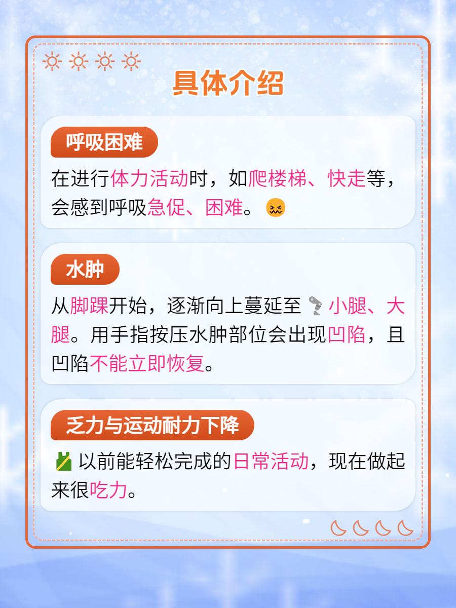 水肿通常是从脚踝这个部位开始出现的,就好像是从身体的低处逐渐开启了一场“肿胀之旅”。然后它会慢慢向上蔓延,先是小腿,就像水慢慢漫过堤岸一样,接着会蔓延至大腿。当用手指轻轻按压水肿部位的时候,会出现一个明显的凹陷,而且这个凹陷并不能像正常的皮肤那样立刻恢复原状,就好像这个部位的皮肤弹性已经被水肿“偷走”了。 对于全身性水肿严重的心衰患者来说,情况会更加糟糕,可能会出现全身性的水肿,不仅仅局限于下肢了,像腹部也会被水肿“侵袭”,变得肿胀起来,上肢等部位也会有水肿的表现,就好像整个身体都被水肿的阴影笼罩着。🍭