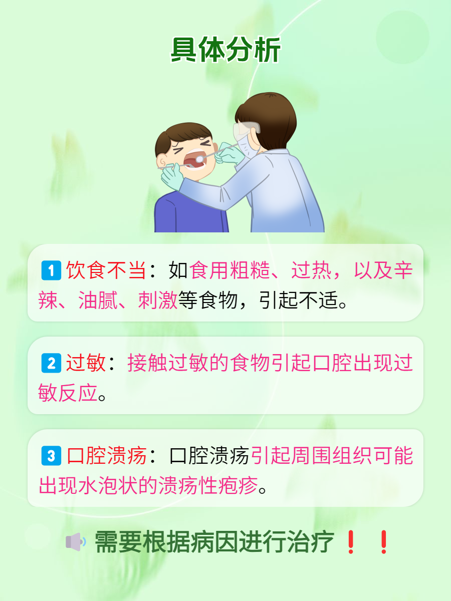 🎈3、口腔溃疡:口腔黏膜的一种常见病变,可能由遗传、感染、维生素缺乏等多种因素引起。当溃疡形成时,其周围组织可能出现水泡状的溃疡性疱疹。