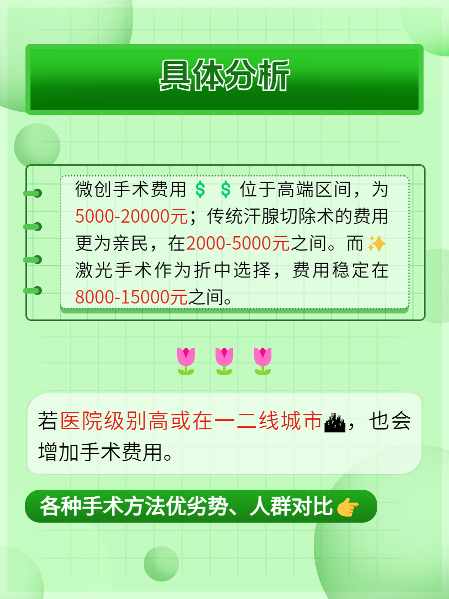 首先,我认为手术方式是决定费用的关键因素之一。微创手术因其创伤小、恢复快的特点,费用相对较高,通常在5000-2000元之间;而传统手术如汗腺切除术,费用则可能在2000-5000元。激光手术则介于两者之间,费用一般为8000-15000元。