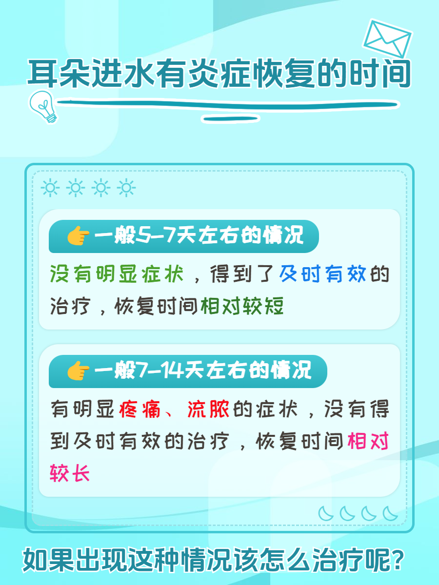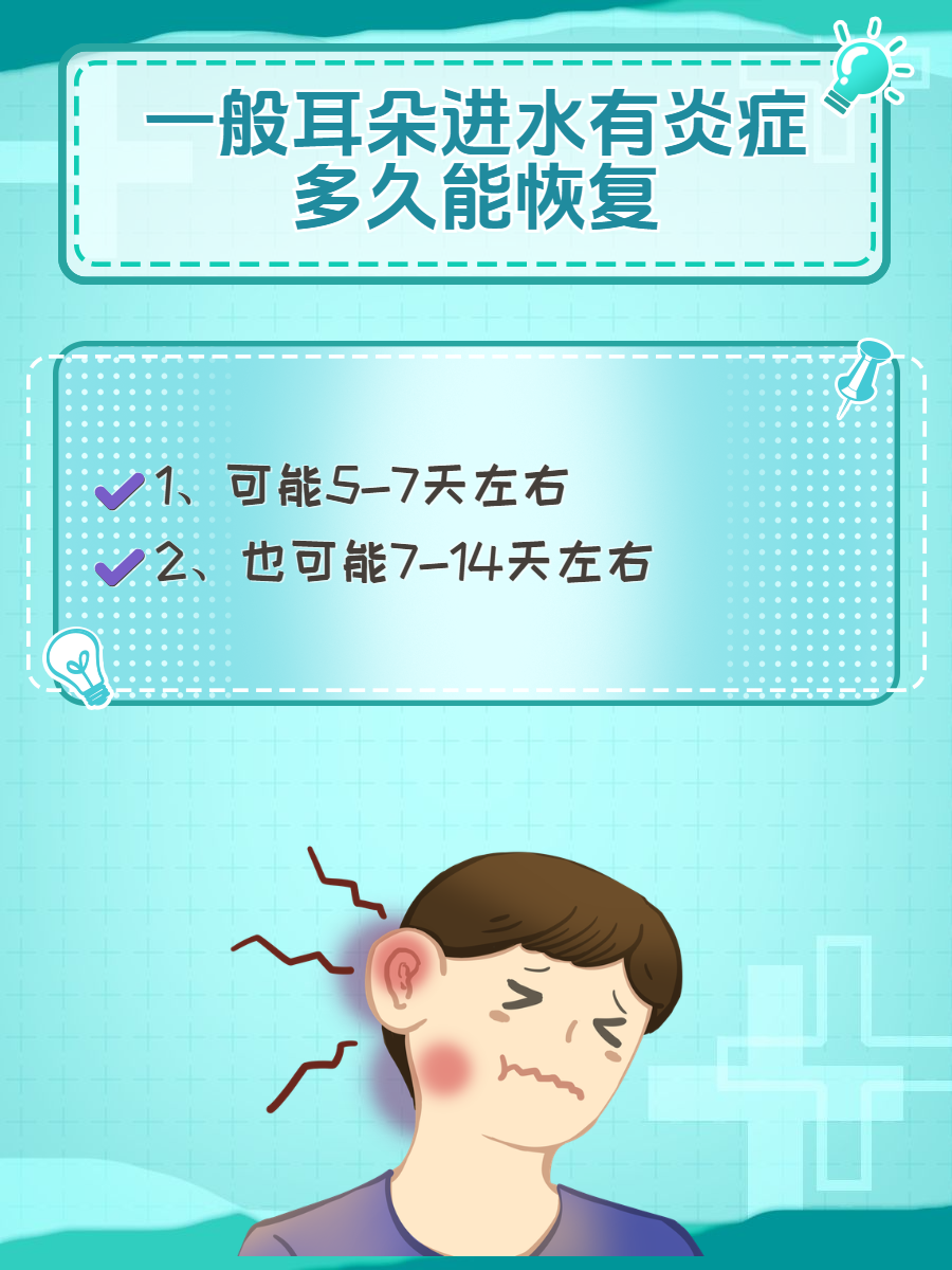 🌼2、一般7-14天左右的情况:如果耳朵进水后引发了较为严重的炎症,如外耳道炎、外耳道湿疹加重,或者出现了急性中耳炎、鼓膜穿孔等情况,恢复时间就会相应延长。这种情况可能需要7天至14天,甚至更长。