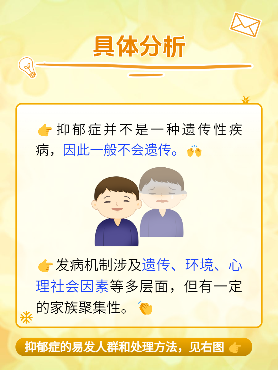 🌟首先,需要明确的是,抑郁症并非一种典型的遗传性疾病,如某些单基因遗传病那样直接由单一基因决定。这意味着,即使配偶患有抑郁症,也并不意味着下一代一定会患上此病。抑郁症的发病机制复杂多样,涉及遗传、环境、心理社会因素等多个层面。因此,从单一遗传角度来看,🍁我们无需过分担忧其直接遗传性。🍃不可否认的是,抑郁症确实存在家族聚集现象,即如果家族中有成员患有抑郁症,其他成员患病的风险可能会相对增加。这可能与遗传基因中的某些易感位点有关,这些位点可能增加个体对抑郁症的易感性,但并非决定性因素。💥
