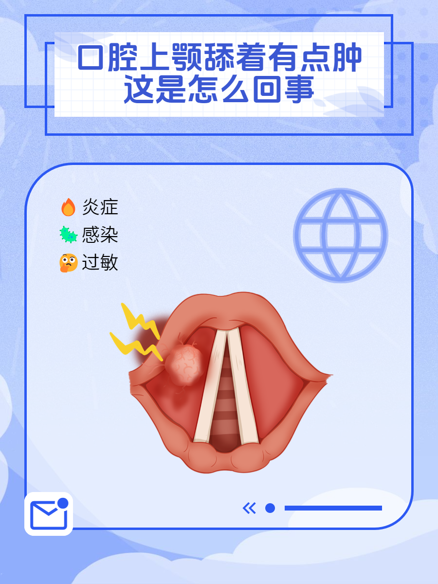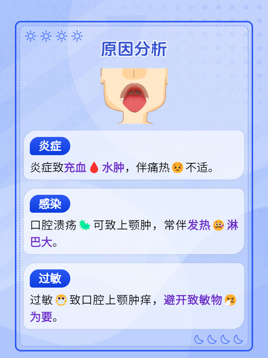 🌈 口腔上颚舔着有点肿可能是由多种原因引起的,包括炎症、感染和过敏等。面对这种情况,我们首先要保持冷静,进行自我观察与初步处理。如果症状持续或加重,应及时就医寻求专业帮助。记住,口腔健康是全身健康的重要组成部分,关注口腔健康就是关爱自己。