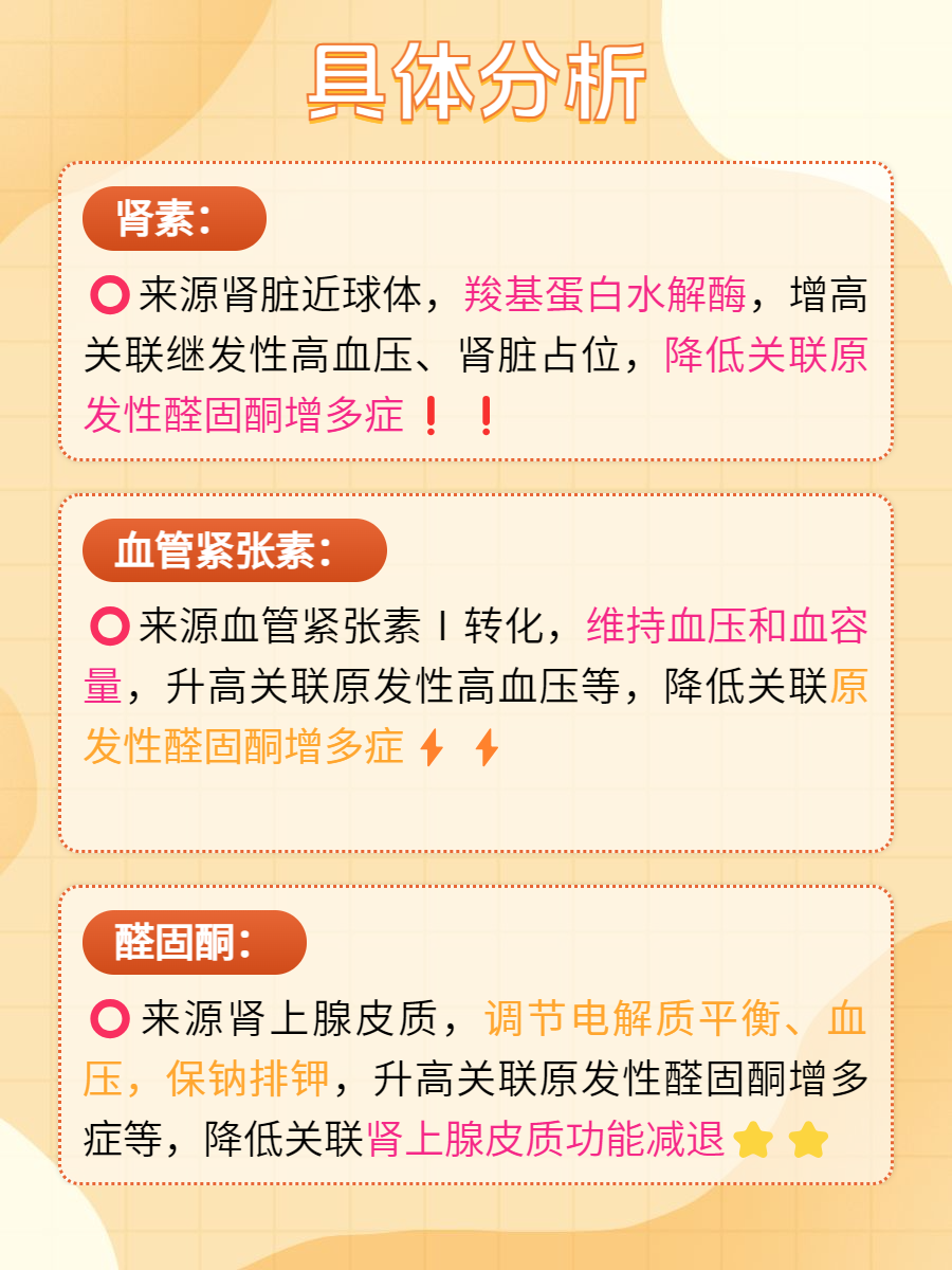 🚫2、血管紧张素:是血管紧张素Ⅰ的进一步转化产物。具有强烈的血管收缩作用,可维持血压和血容量平衡。升高常见于原发性高血压、肾血管性高血压、嗜铬细胞瘤等;降低则可能与原发性醛固酮增多症有关。