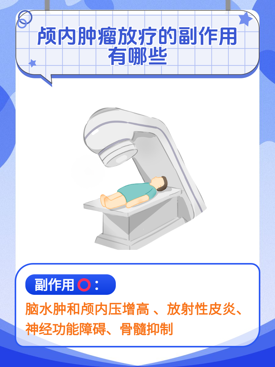 首先,颅内肿瘤放疗的副作用会因为每个人体质的不同而不同,所以副作用的程度也会不一样,并且可能出现的副作用症状也会有所差异。下面是几种常见的颅内肿瘤放疗的副作用:👇