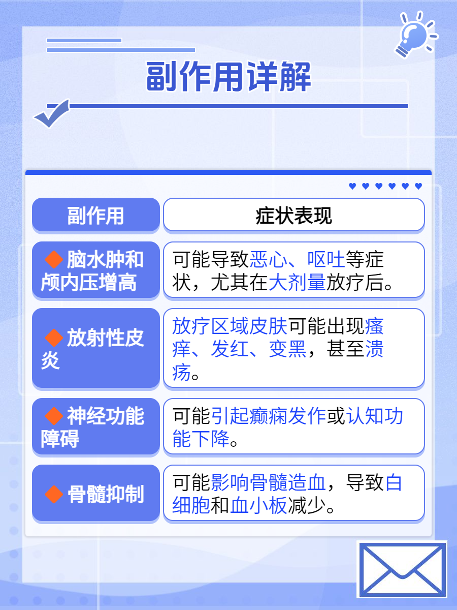 骨髓抑制:放疗可能影响骨髓造血功能,导致白细胞、血小板减少,从而增加感染风险和出血倾向。😧