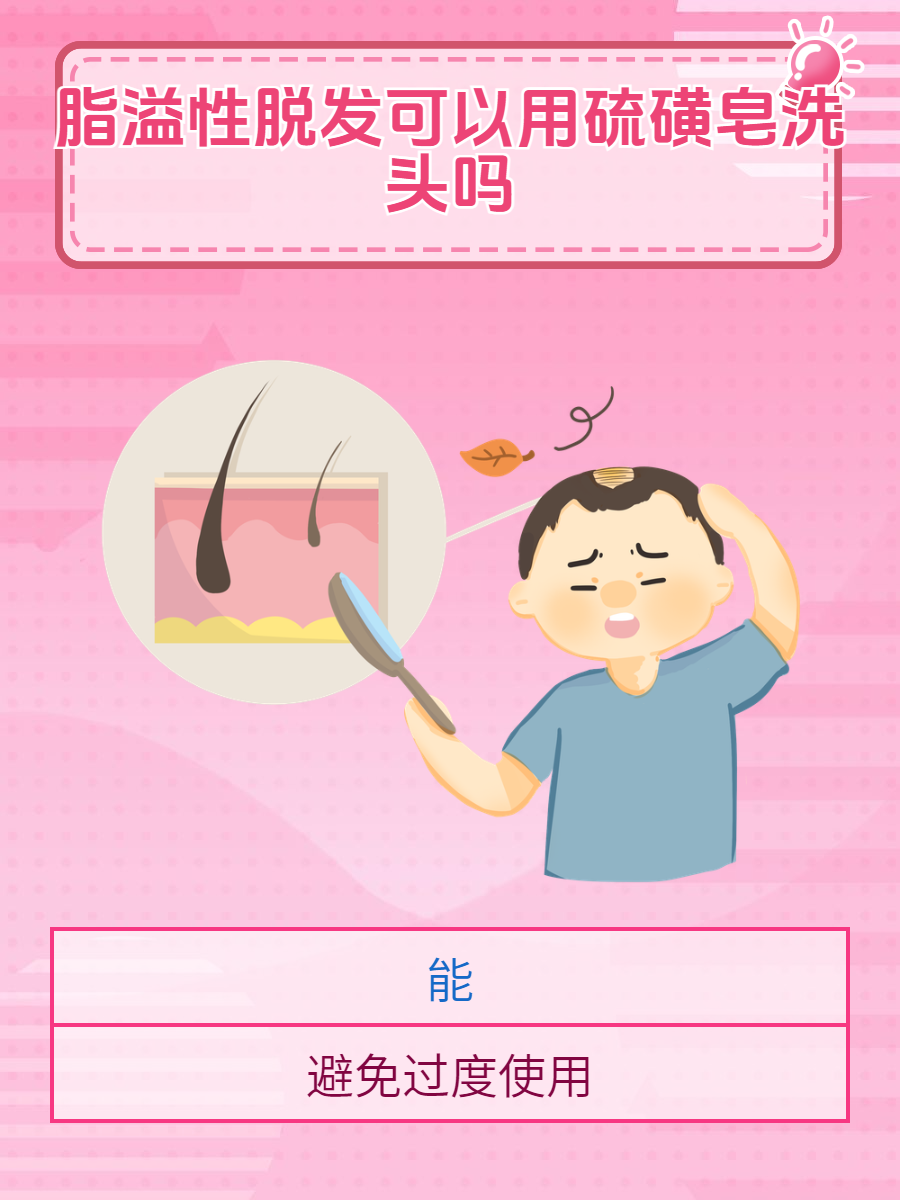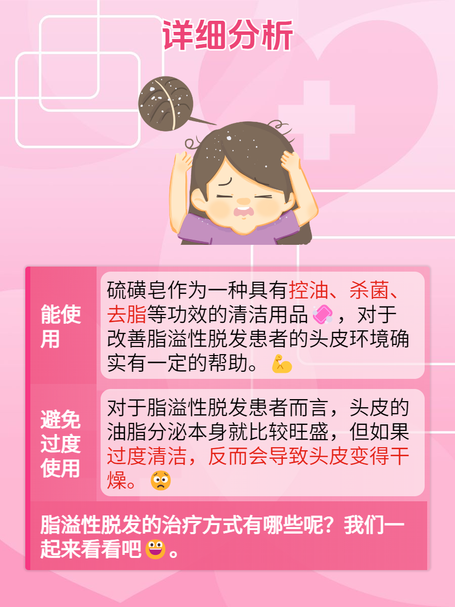 脂溢性脱发患者可以适当使用硫磺皂洗头来改善头皮环境,但需注意控制使用频率、注意个体差异,并结合其他治疗方法进行综合治疗。希望今天的分享能对大家有所帮助,如果还有疑问,请大家点赞并留言。👍💬😃