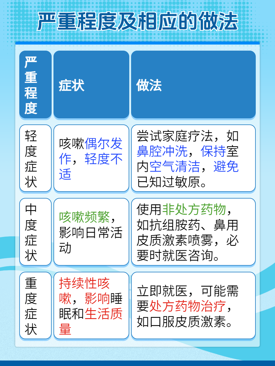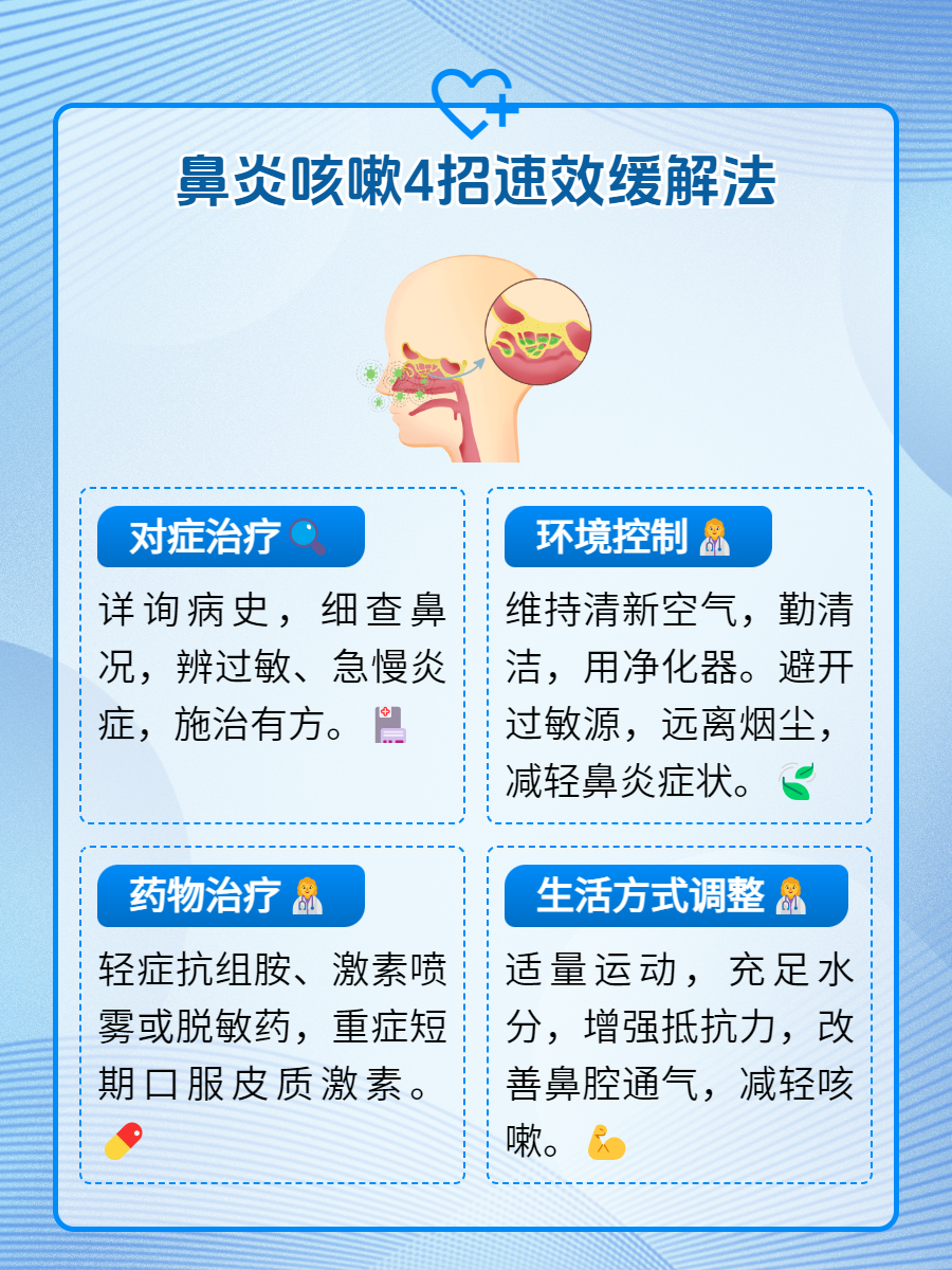 根据鼻炎类型,医生可能会推荐使用抗组胺药、鼻用皮质激素喷雾或口服脱敏药物。在严重情况下,可能需要短期使用口服皮质激素。咳嗽症状明显时,可以使用止咳药或祛痰药缓解。💊