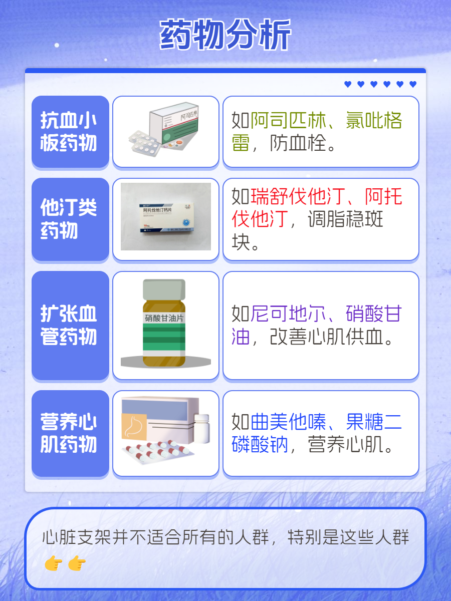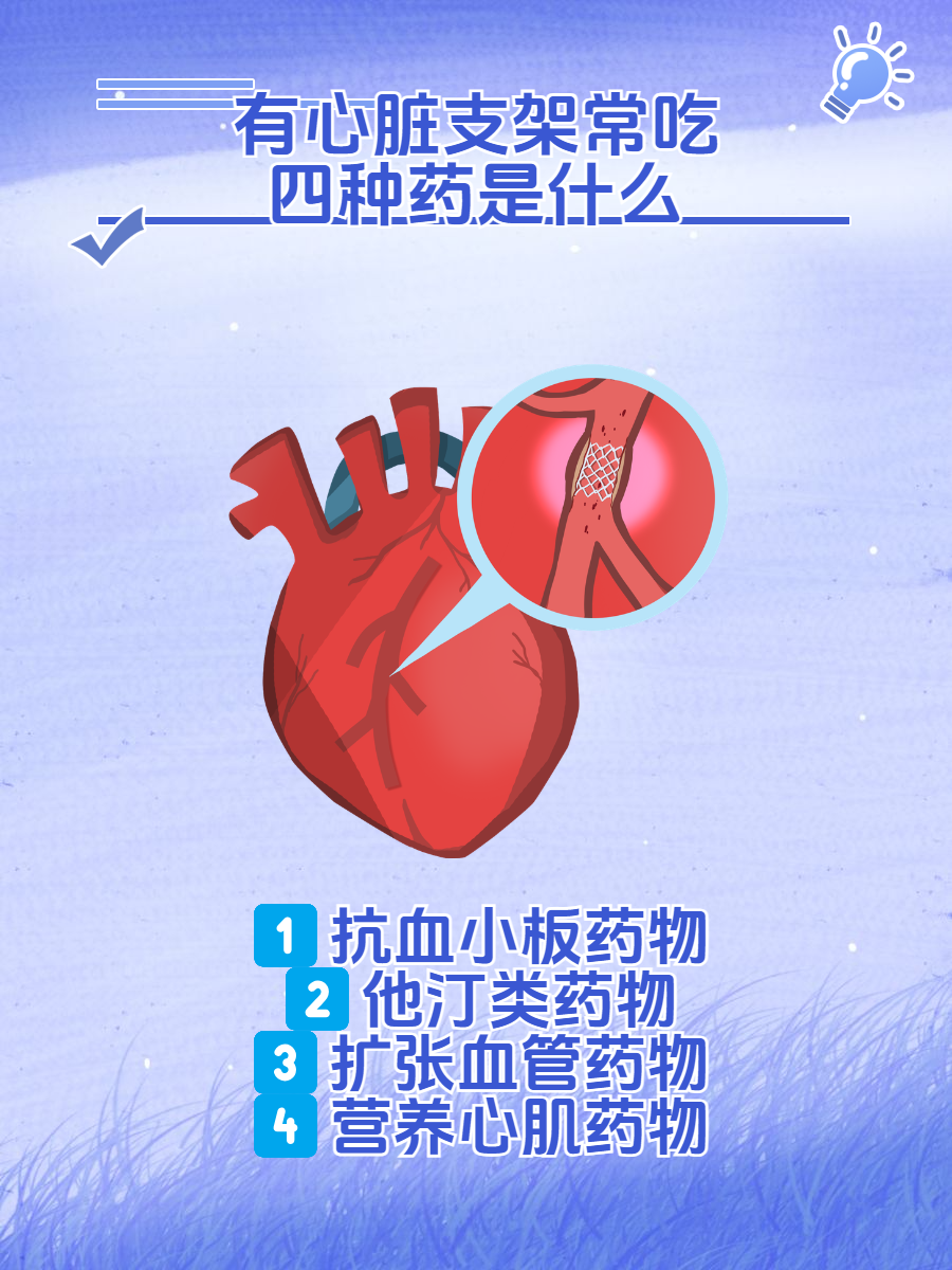 心脏支架又称冠状动脉支架,是心脏介入手术中常用的医疗器械,具有疏通动脉血管的作用。安装完心脏支架以后,也需要定期用药控制。那么,常吃的药物有哪些呢?我给大家介绍一下。
