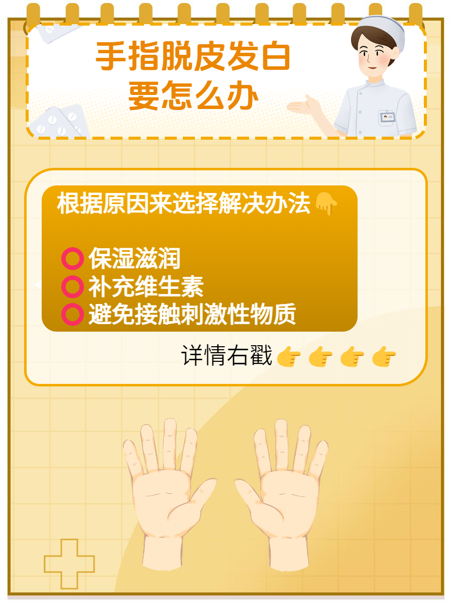 其实,要解决手指脱皮发白需要根据具体病情来选择合适的方法。💊以下所列举的原因是临床工作中碰到比较多的: