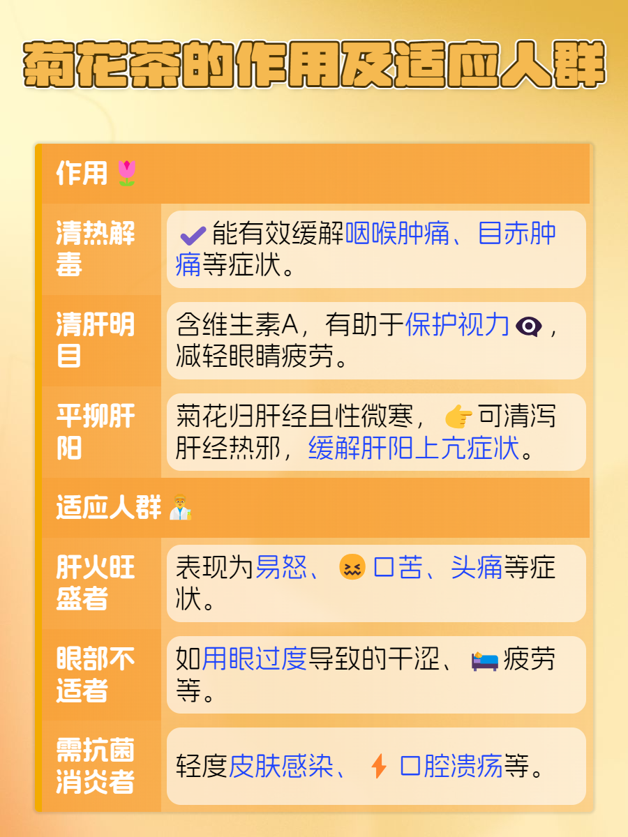 🙌如果饮用菊花茶后出现了不适症状,如腹痛、皮疹等,一定要及时就医。并且在自行饮用菊花茶前,如果不确定自己是否适合,最好先咨询医生的意见。