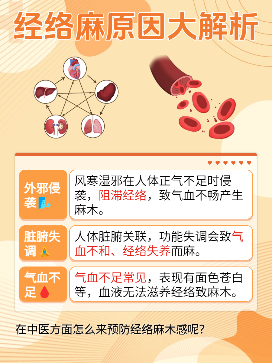 中医认为,风寒湿邪等外界因素易侵袭人体,尤其是当人体正气不足时,更易导致经络受阻,气血运行不畅,从而产生麻木感。例如,寒冷天气或长时间处于空调环境中,都可能导致经络受寒而麻。