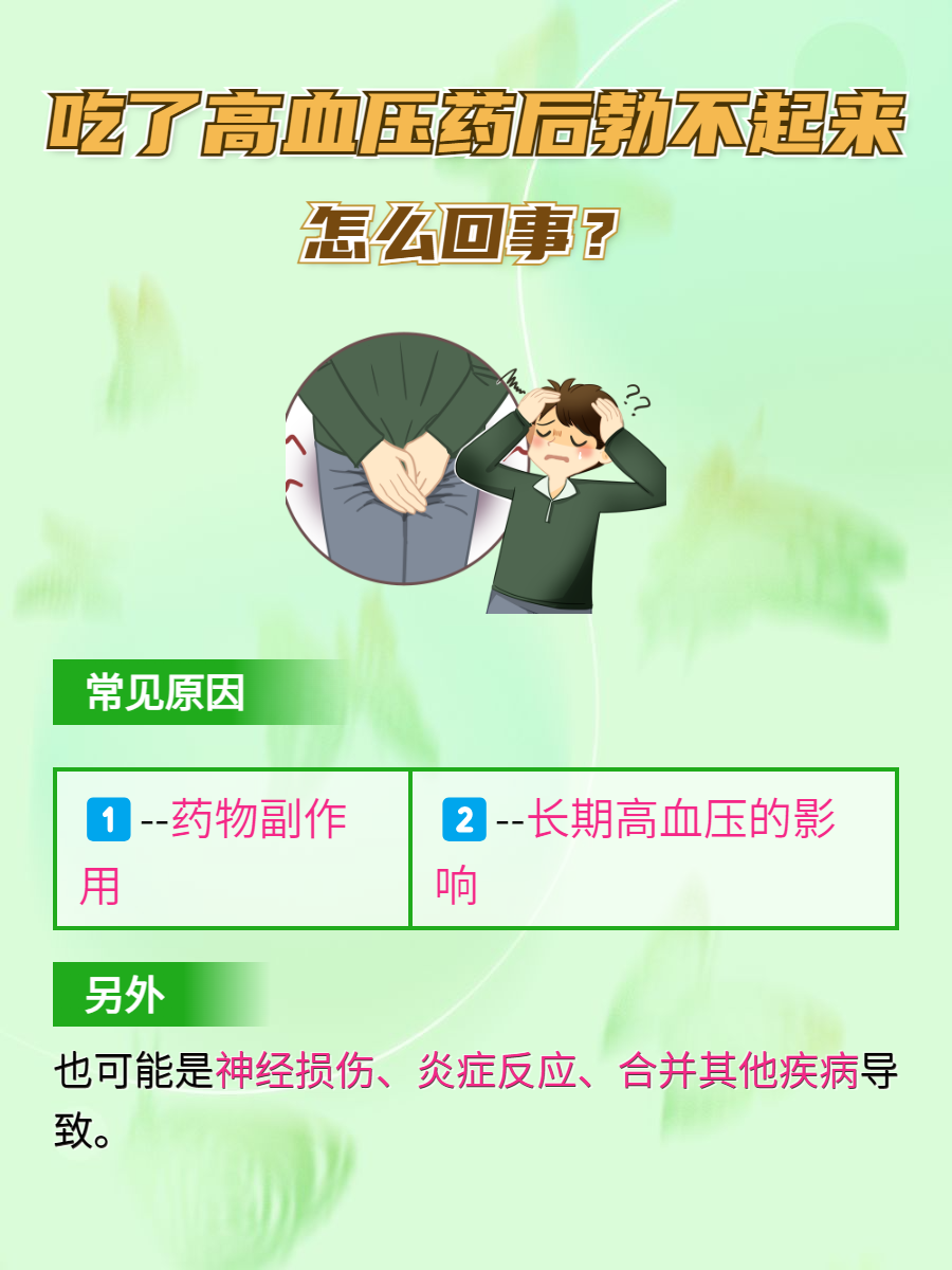 针对高血压患者,临床上主要选用降压药物来控制血压,但服用药物的过程中,有可能会引起药物副作用🙁,进而出现一系列临床症状。有些男性患者可能会在吃药后出现阴茎勃不起来的现象,那这种现象究竟是怎么回事呢?接下来为您答疑解惑✔️。