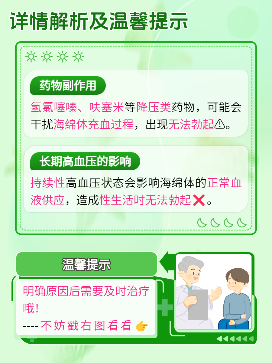 🌈1、药物副作用:如果患者选择β受体阻滞剂、利尿剂等药物进行降压处理,这些药物成分作用于机体,可能会影响血液循环,减少去甲肾上腺素的分泌,进而出现阴茎无法勃起的现象。