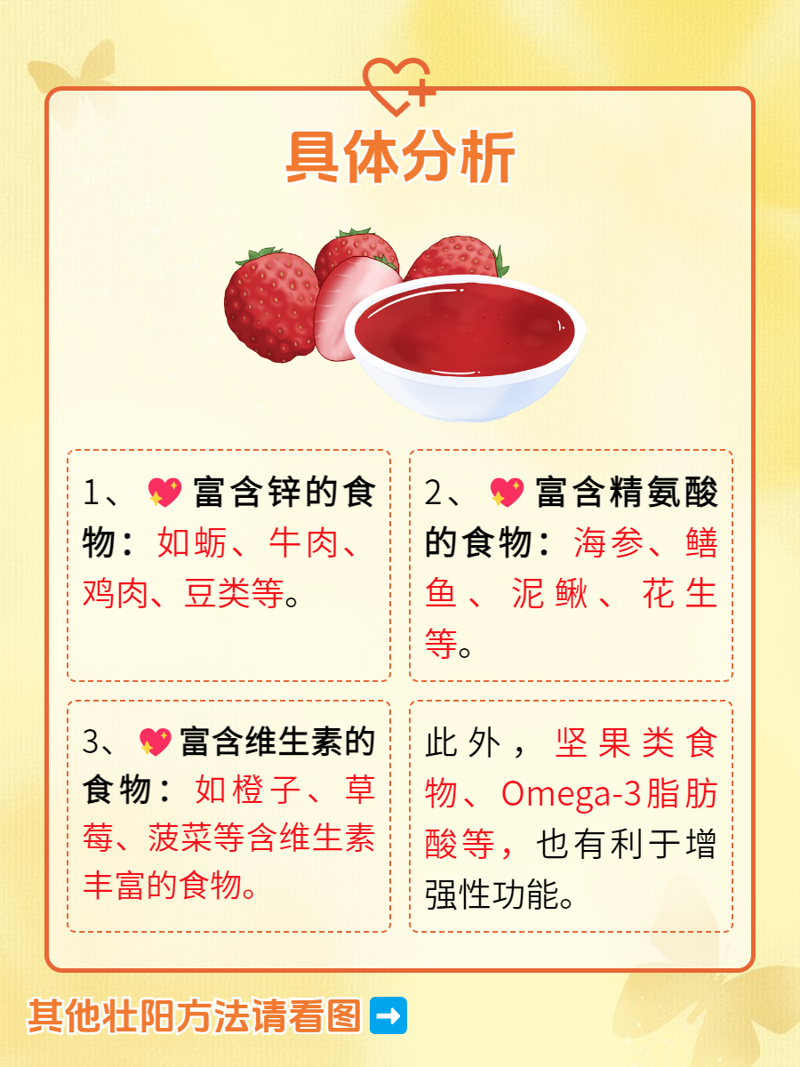 1、富含锌的食物:😃牡蛎、牛肉、鸡肉、豆类等食物富含锌元素。锌对于男性生殖系统的正常功能至关重要,它可以促进睾丸激素的分泌,提高精子质量和数量,从而有助于增强性功能。