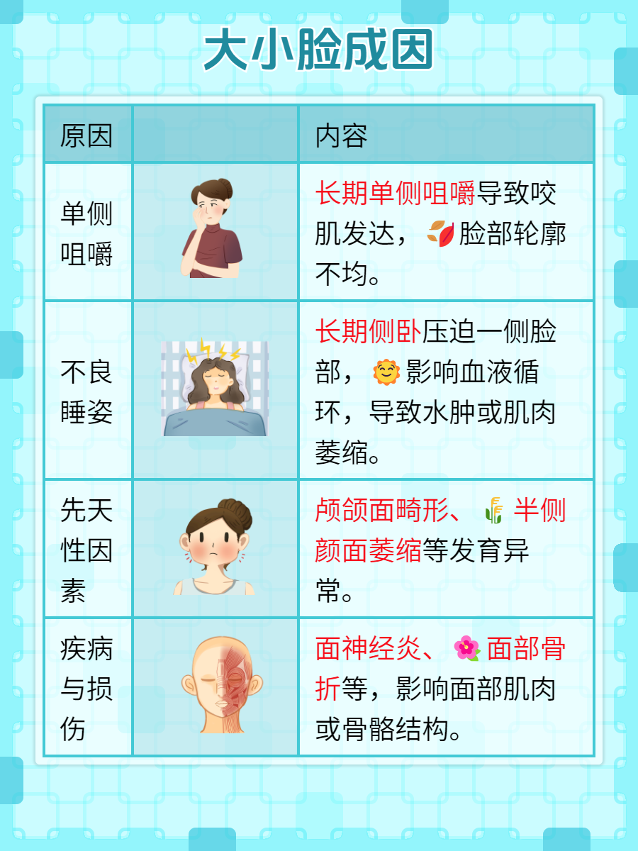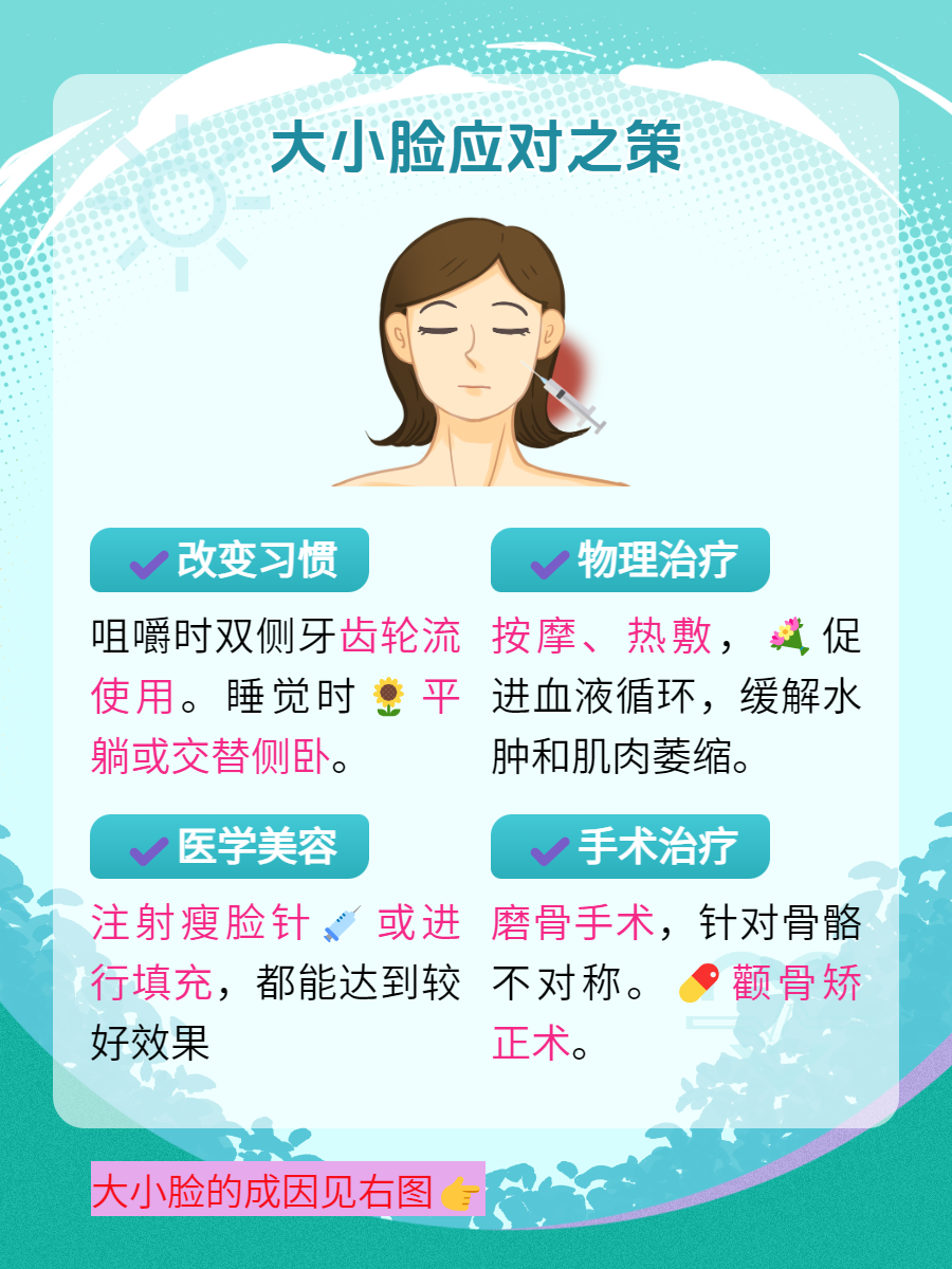 医学美容:如果大小脸现象较为严重且难以通过日常习惯改善,可以考虑医学美容手段。如注射瘦脸针使咬肌萎缩、面部填充使较小的一侧丰满等。但请务必在正规医院和专业医生指导下进行。💉