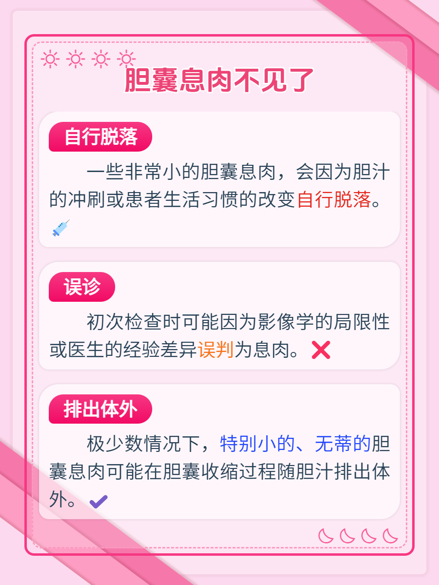 🔍3. 排出体外:那些体积极小且没有蒂部连接的胆囊息肉,可能会在胆囊的自然收缩过程中意外地脱离其附着点,并随后随着胆汁的流动被排出至体外。这种情况更为罕见,但也不能完全排除。