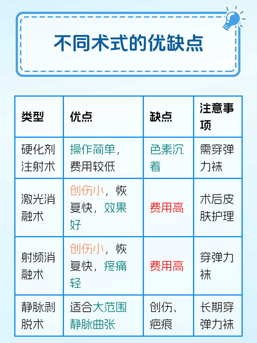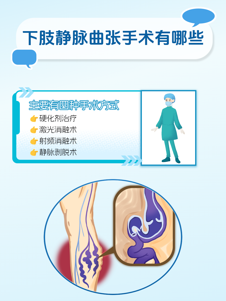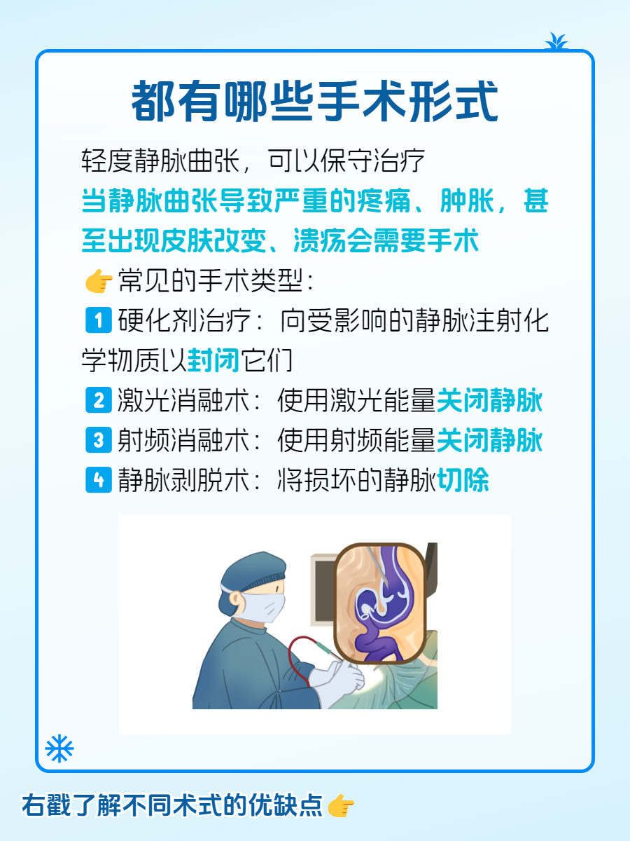 手术选择取决于静脉受损的程度和位置,另外对于下肢静脉曲张手术,我们不应该过分恐惧。随着医疗技术的发展,手术方法越来越微创,恢复期也越来越短。🚀
