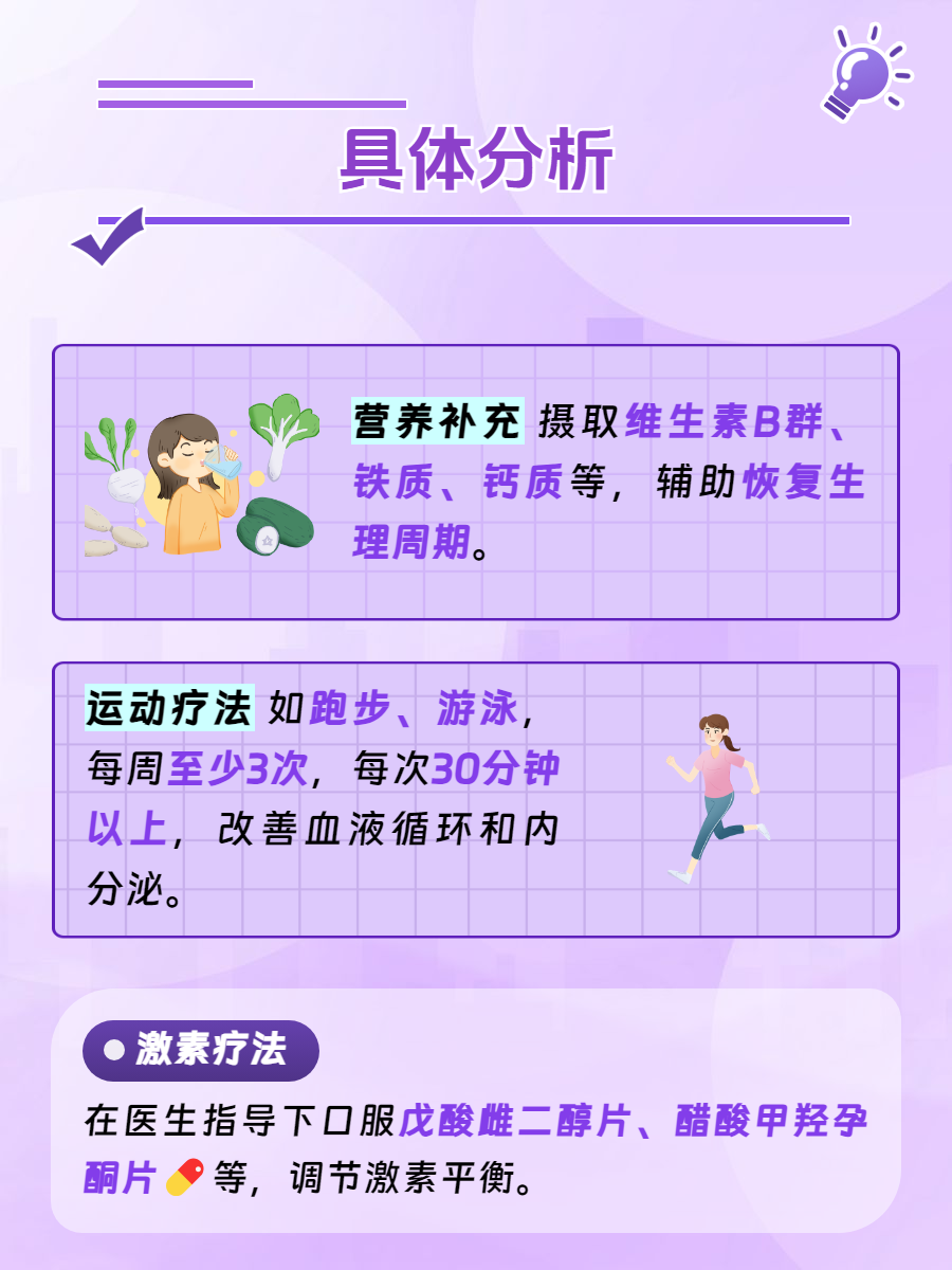 1、营养补充:营养补充可能涉及维生素B群、铁质及钙质等的摄取增加。这些营养素对女性生殖系统功能有重要作用。能够提供足够的营养成分可辅助恢复正常的生理周期。