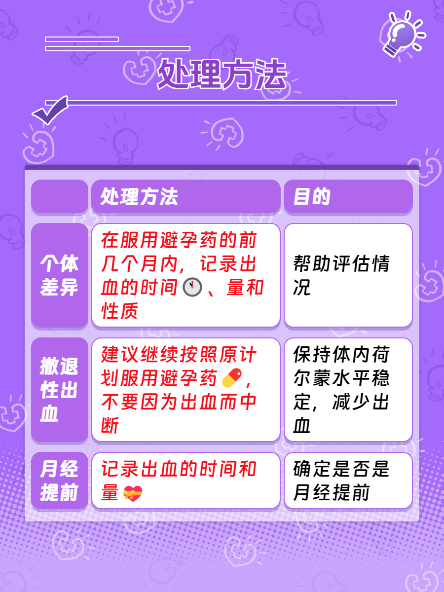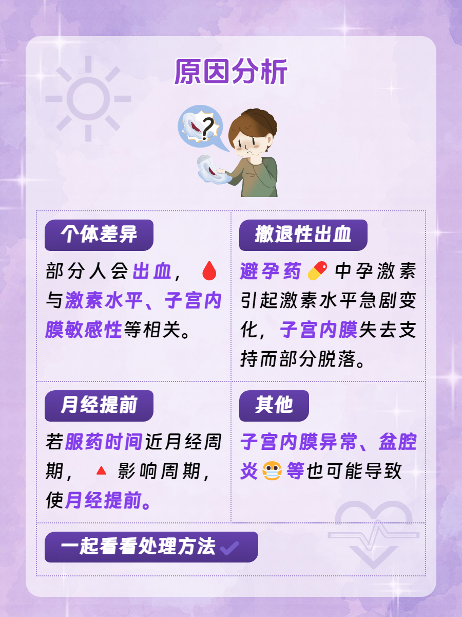 如果出血情况持续不缓解或者出现其他异常症状,应及时就医,进行相关检查😃。同时,在日常生活中要正确使用避孕药,选择适合自己的避孕方法,保护好自己的身体健康💪。