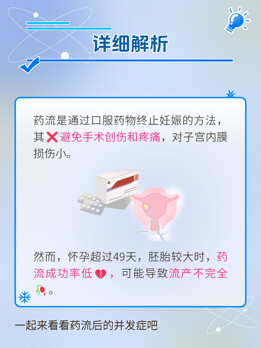 ✨然而,药流也并非适用于所有情况。如果怀孕时间超过49天,胚胎较大,药流可能会失败,导致流产不完全,需要进行清宫手术,这会增加患者的痛苦和风险。