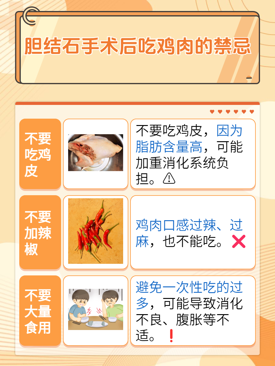 胆结石手术后的饮食调整,是恢复过程中的重要一环。关于能否吃鸡肉这个问题,我的建议是在术后恢复良好,无并发症的情况下,适量食用鸡肉是可以的。但需注意烹饪方式和食用量。