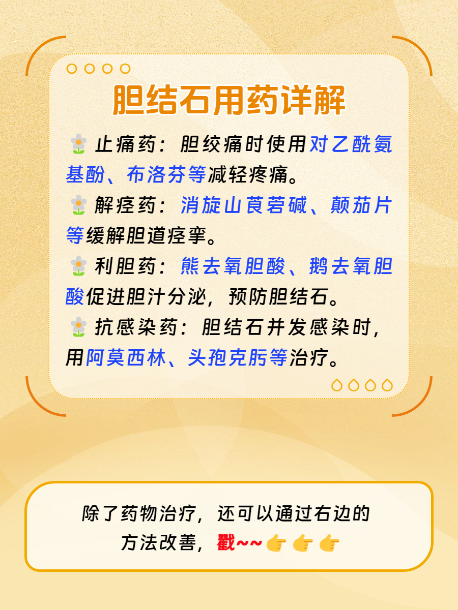 🌼利胆药类:利胆药通过促进胆汁的分泌和排泄,有助于减少胆汁淤积,从而预防和控制胆结石的进一步发展👊。常用的利胆药包括熊去氧胆酸胶囊、鹅去氧胆酸片,能够降低胆汁中胆固醇的饱和度,有助于胆固醇结石的溶解,同时具有一定的利胆作用。