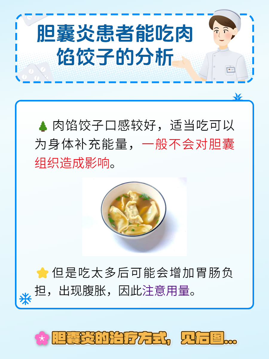 🎄胆囊炎,顾名思义是指胆囊部位出现了炎症,那么在患病期间究竟能不能吃肉馅的饺子呢?答案是可以的。肉馅饺子的口感比较鲜美,适当吃肉馅饺子,可以为身体补充能量,达到满足饱腹感的效果,可能不会对胆囊组织造成影响。只不过,要注意肉馅饺子的食用量,不能多吃,容易增加胃肠道负担,出现胃胀、排气过多等现象。