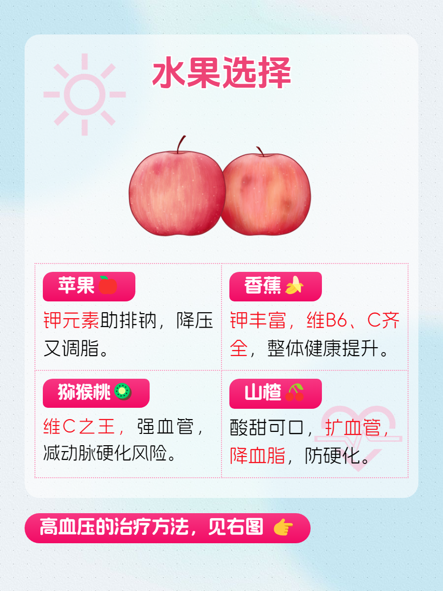 😊苹果:苹果中的钾元素有助于体内钠的排出,从而减轻血管压力,达到辅助降压的效果。此外,苹果中的果胶和膳食纤维也有助于调节血脂,维护心血管健康。🍎
