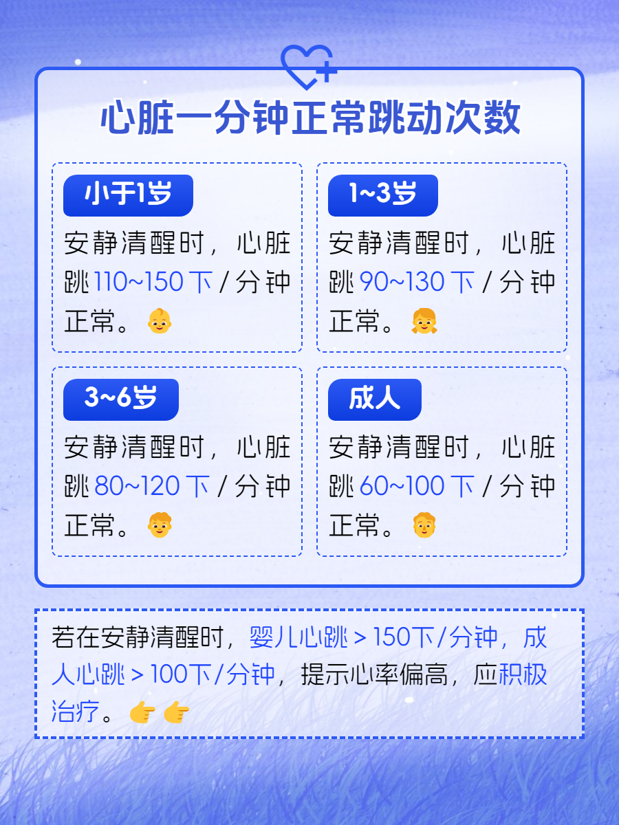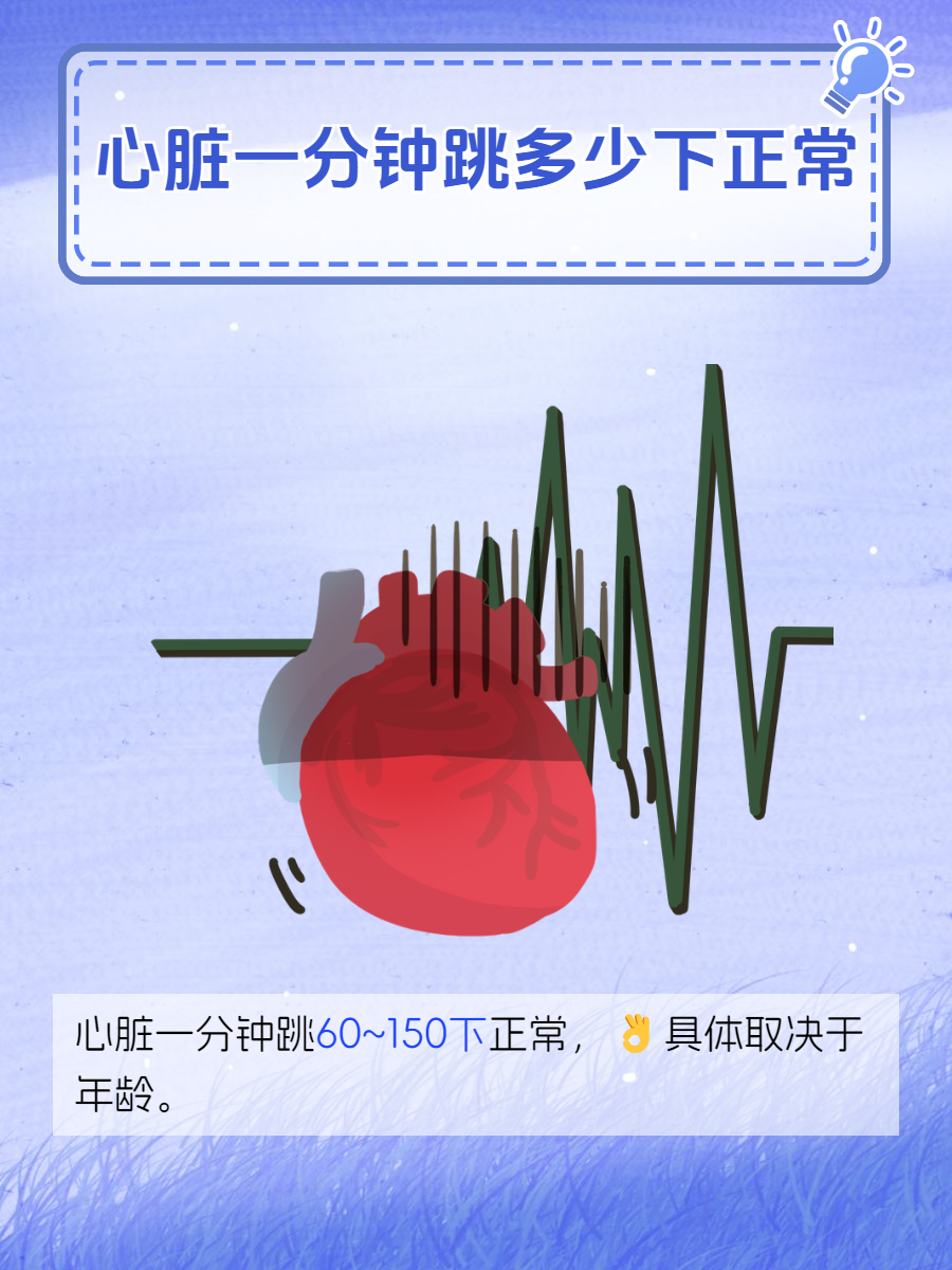 心脏一分钟跳多少下正常不能一概而论,主要取决于年龄。🌟成年人在安静、清醒的情况下,心脏一分钟跳60~100下正常;👶小于1岁,心脏每分钟跳110~150下;1~3岁,心脏每分钟跳90~130下;👧3~6岁,心脏每分钟跳80~120下。在特殊生理情况下,心脏每分钟跳动次数可能会出现异常,比如儿童较快,老年人偏慢,运动后心跳次数加快,深呼吸时减慢。🤚
