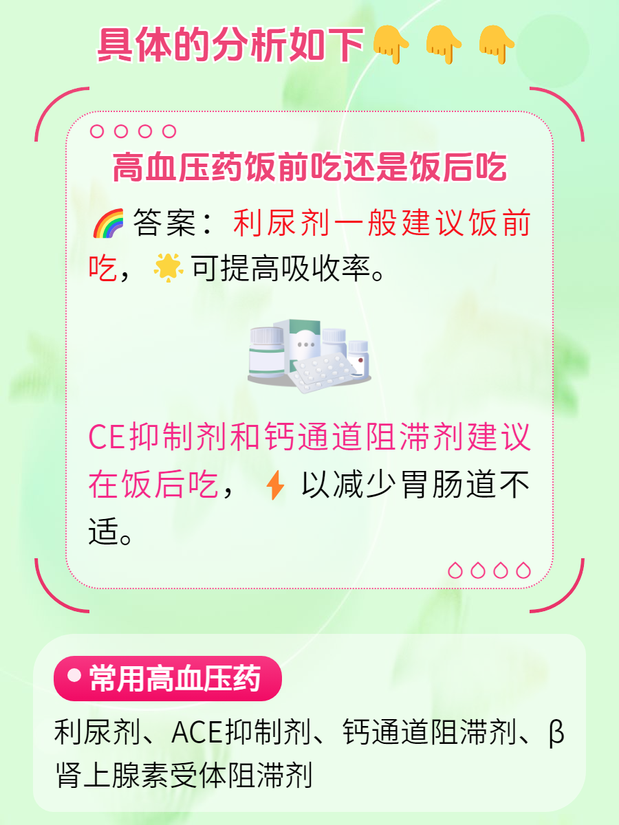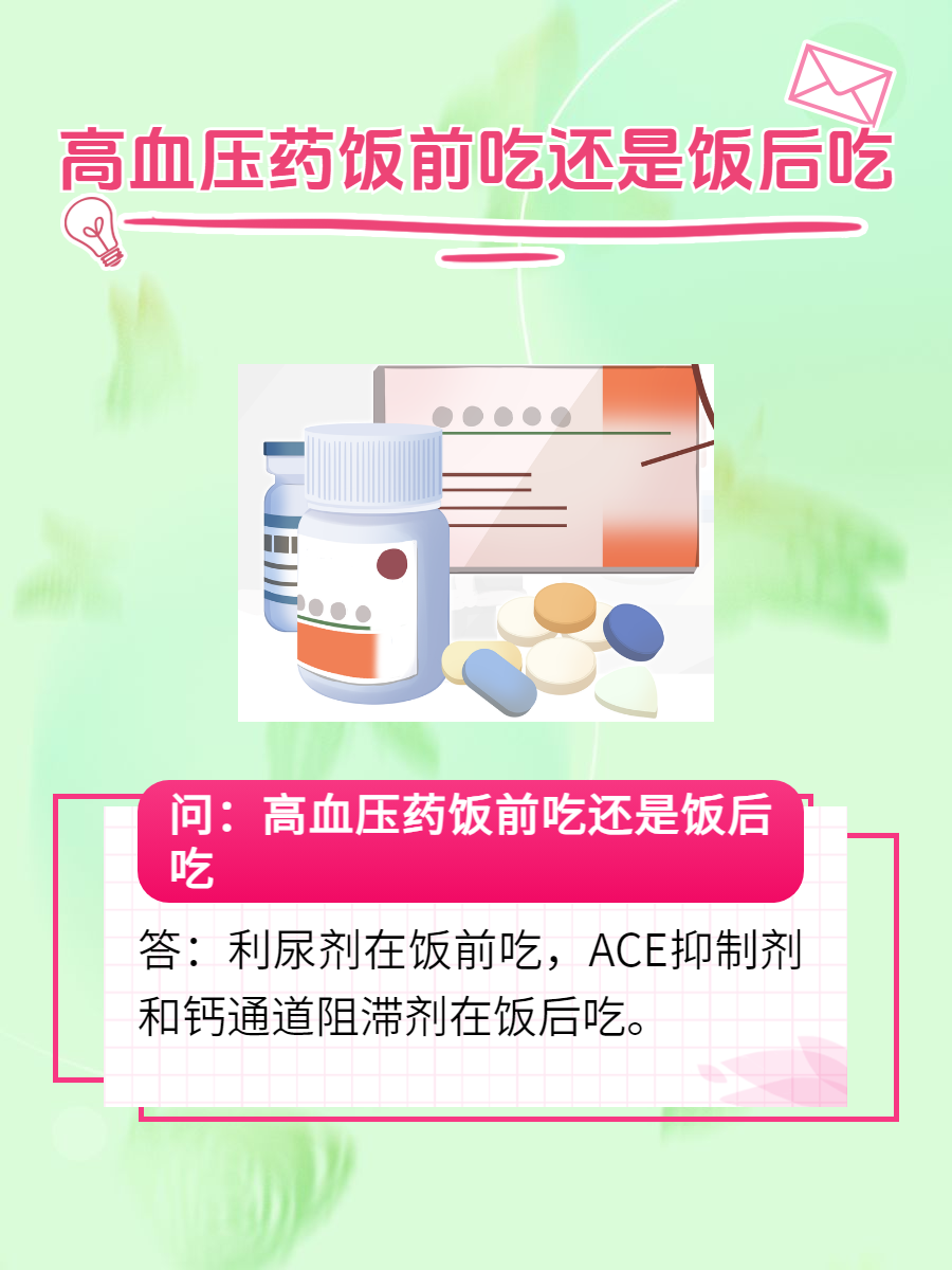 🌈高血压药在饭前还是饭后吃取决于药物的类型,比如利尿剂一般建议在早晨空腹状态时吃,也就是饭前吃,这样为了提高药物的吸收率,而且白天吃利尿剂可在白天大量排尿,而不影响夜间休息。另外,ACE抑制剂和钙通道阻滞剂建议在饭后吃,因为药物会对胃肠道造成刺激引发不适,饭后吃药可以减少这些良反应,尤其是胃肠道不好的患者,更建议在饭后吃药。