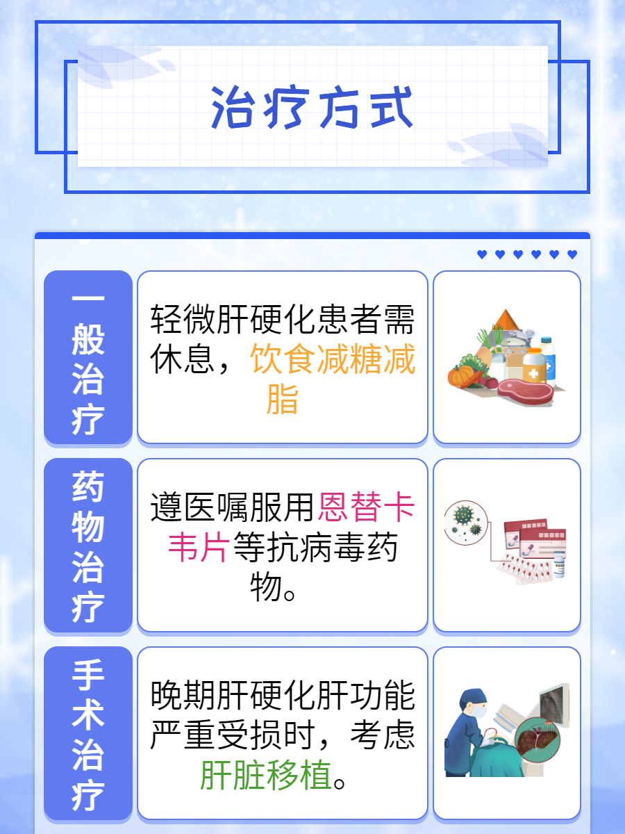 🔷1、一般治疗:对于轻微肝硬化的患者,日常应注意休息,避免过度劳累,同时调整饮食结构,减少高糖、高脂食物的摄入,以减轻肝脏负担。