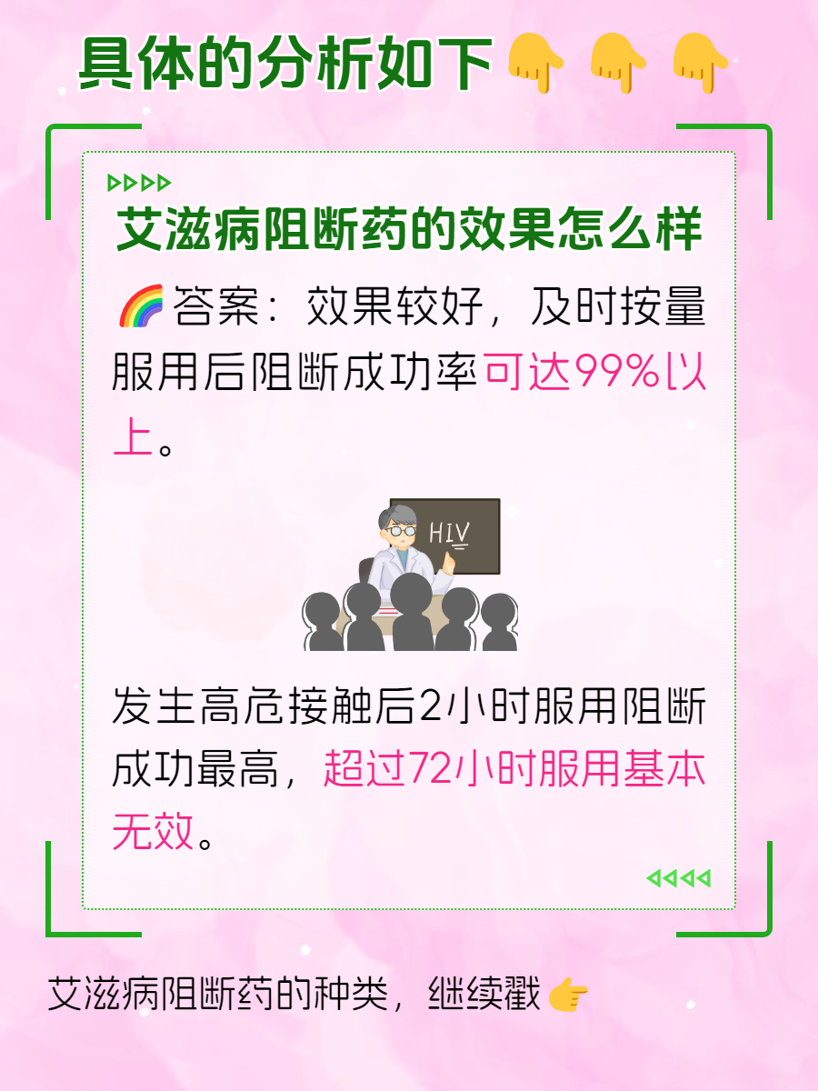👉艾滋病阻断药的效果比较好,阻断感染成功率可达到99%以上,也就是说高风险人群只要及时按量服用这种阻断药,可以大大降低感染几率。一般情况下,在发生高危接触后2小时内服用阻断药为最佳时间,不要超过24小时,在72小时内服用阻断药也能起到一定的阻断效果,但是超过72小时基本无阻断效果。