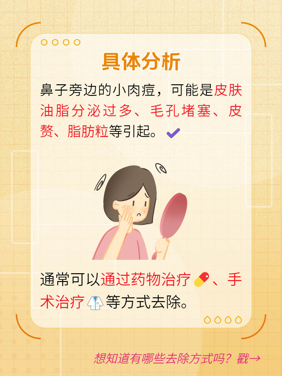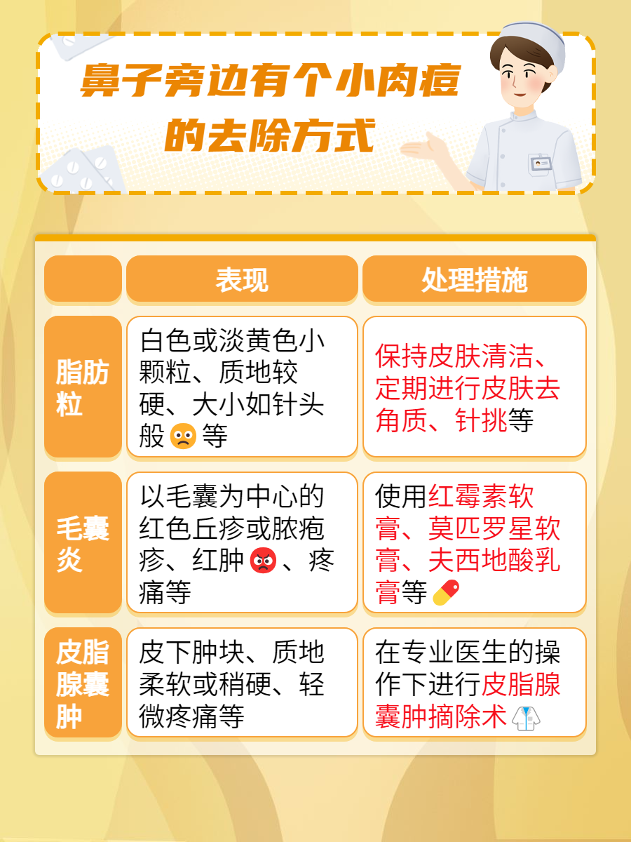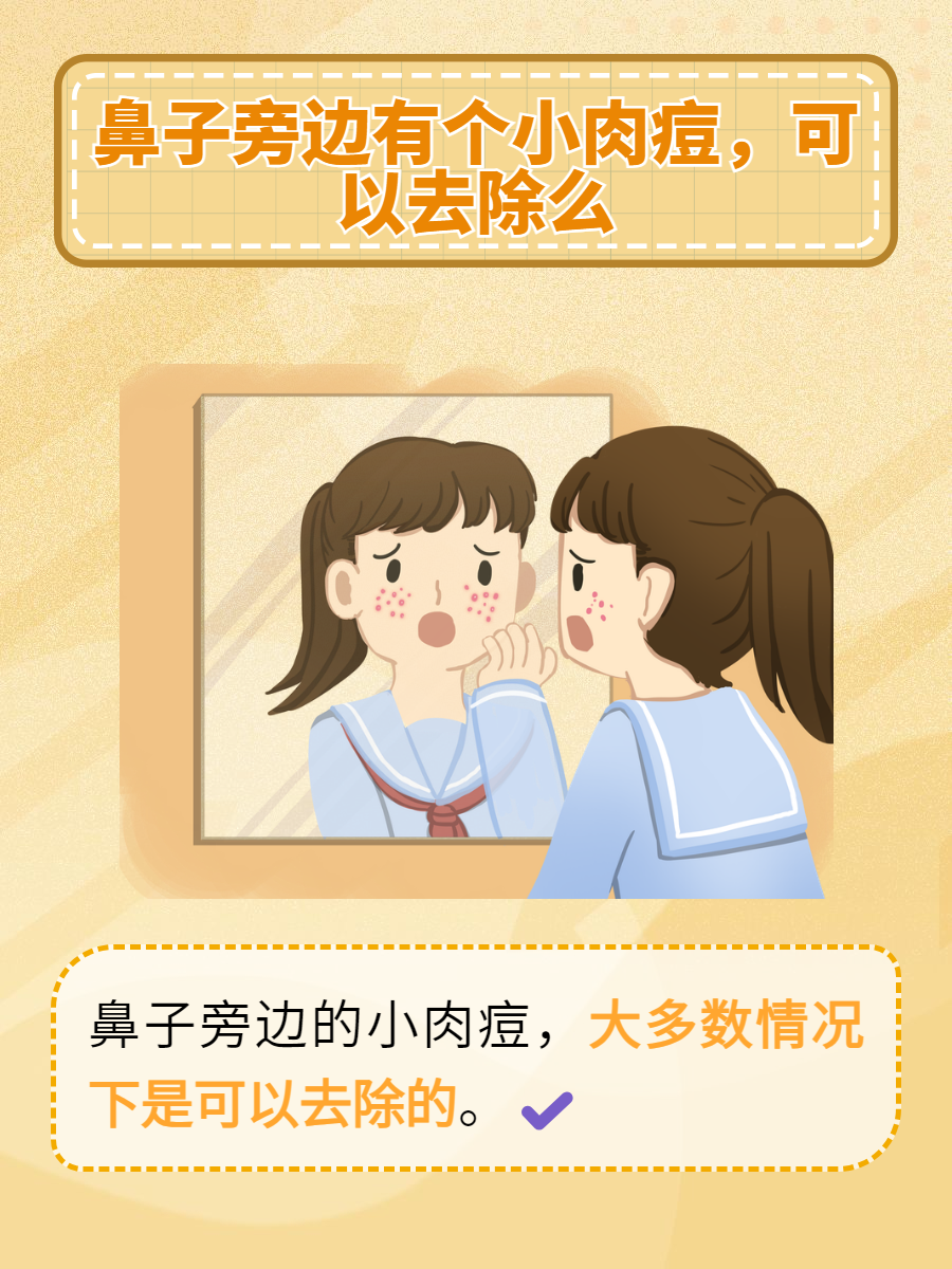 鼻子旁边的小肉痘,大多数情况下是可以去除的!不过,关键在于了解它的成因,并采取正确的方法。可能是皮肤油脂分泌过多、毛孔堵塞形成的粉刺,也可能是皮肤增生引起的小肉粒,比如皮赘或脂肪粒。还有可能是毛囊炎、寻常疣、皮脂腺囊肿等,主要是由于细菌感染、病毒感染等原因导致,可以通过药物治疗、手术治疗等方式去除,能够起到缓解作用。