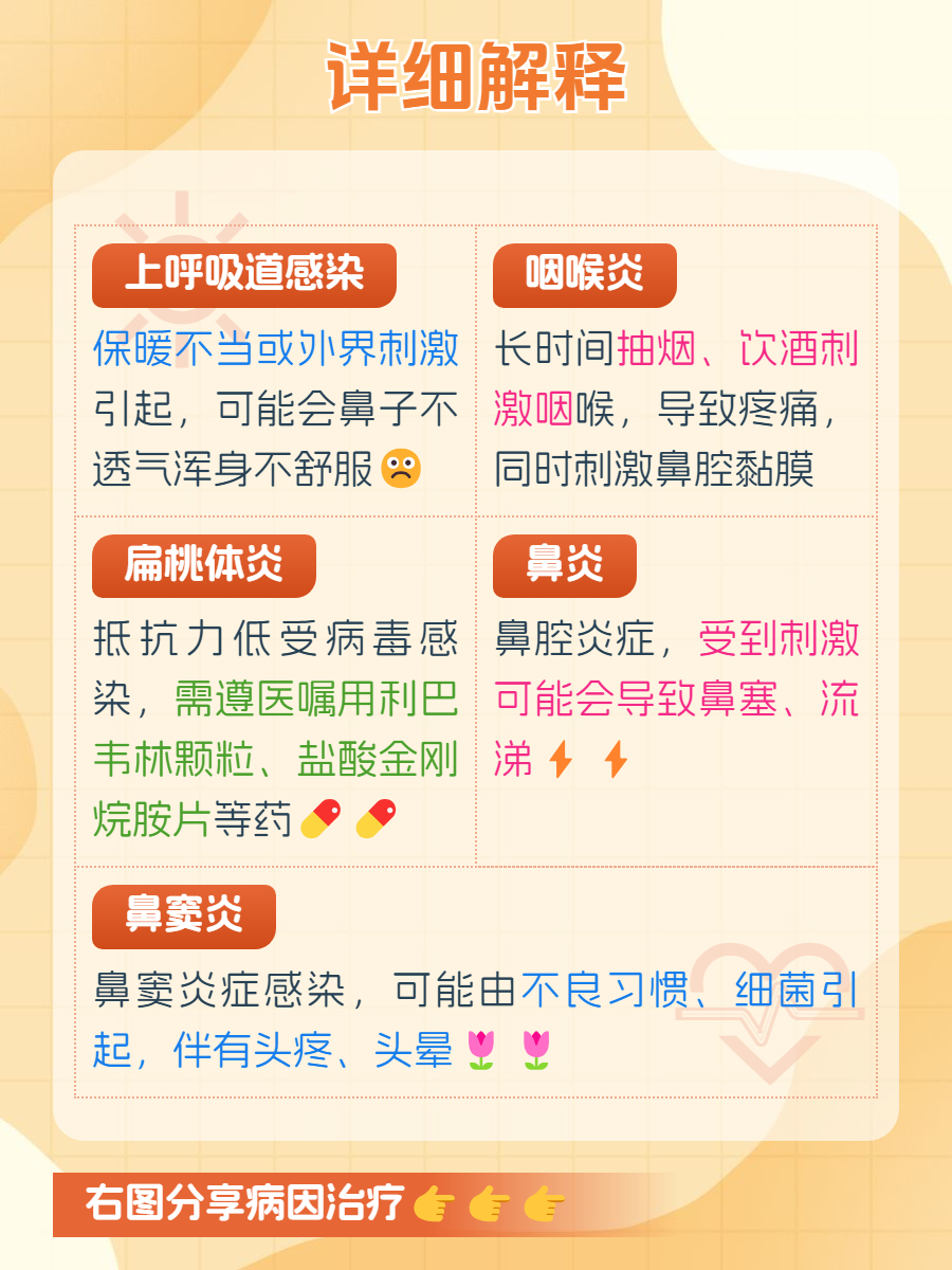 4、鼻炎:是指鼻腔内部出现的炎症感染,在受到刺激之后会引起鼻塞、流鼻涕。